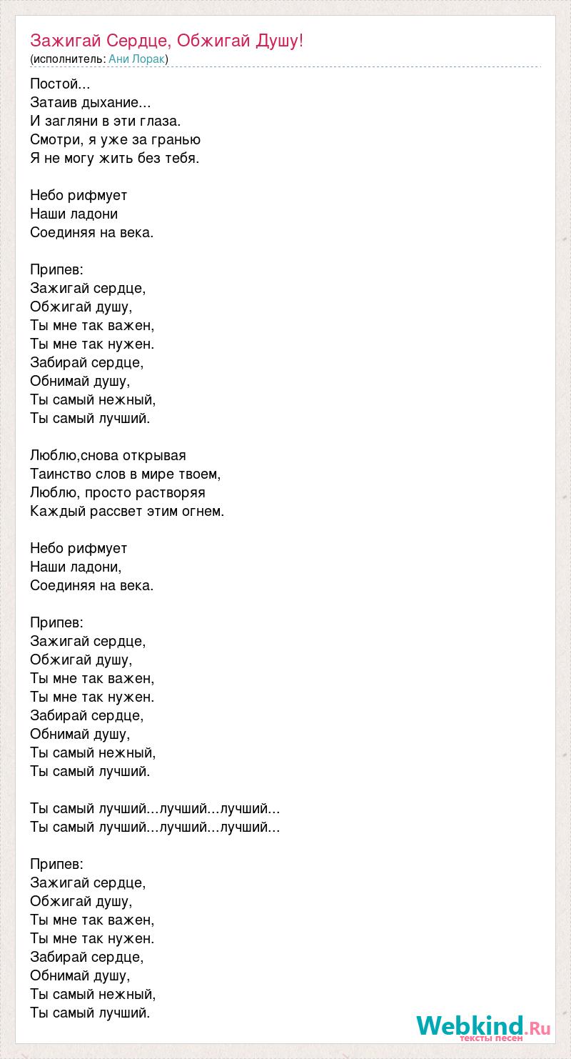 Постой... Затаив дыхание... И загляни в эти глаза. Смотри, я уже за гранью Я не могу жить без тебя. Небо рифмует Наши ладони Соединяя на века. Припев: Зажигай сердце, Обжигай душу, Ты мне так важен, Ты мне так нужен. Забирай сердце, Обнимай душу, Ты самый нежный, Ты самый лучший. Люблю,снова открывая Таинство слов в мире твоем, Люблю, просто растворяя Каждый рассвет этим огнем. Небо рифмует Наши ладони, Соединяя на века. Припев: Зажигай сердце, Обжигай душу, Ты мне так важен, Ты мне так нужен. Забирай сердце, Обнимай душу, Ты самый нежный, Ты самый лучший. Ты самый лучший...лучший...лучший... Ты самый лучший...лучший...лучший... Припев: Зажигай сердце, Обжигай душу, Ты мне так важен, Ты мне так нужен. Забирай сердце, Обнимай душу, Ты самый нежный, Ты самый лучший.