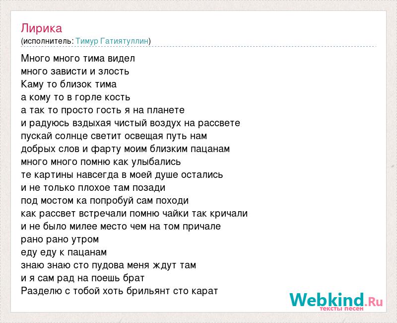 Много много тима видел много зависти и злость Каму то близок тима а кому то в горле кость а так то просто гость я на планете и радуюсь вздыхая чистый воздух на рассвете пускай солнце светит освещая путь нам добрых слов и фарту моим близким пацанам много много помню как улыбались те картины навсегда в моей душе остались и не только плохое там позади под мостом ка попробуй сам походи как рассвет встречали помню чайки так кричали и не было милее место чем на том причале рано рано утром еду еду к пацанам знаю знаю сто пудова меня ждут там и я сам рад на поешь брат Разделю с тобой хоть брильянт сто карат