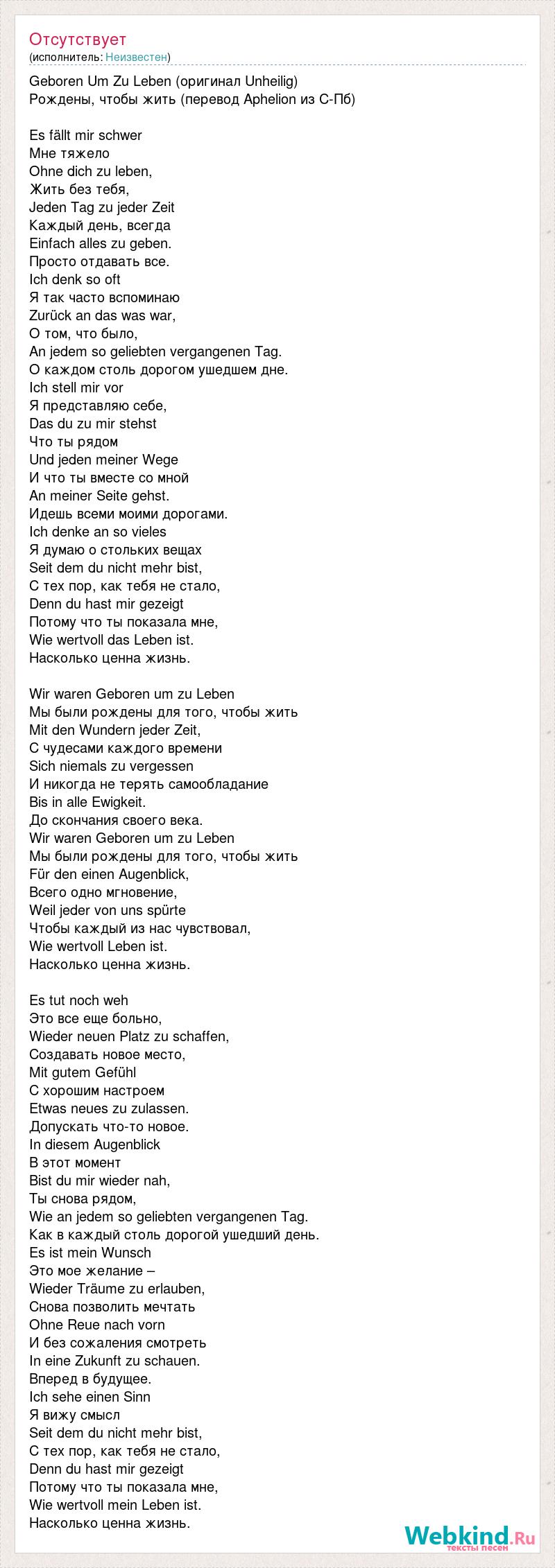 Geboren Um Zu Leben (оригинал Unheilig) Рождены, чтобы жить (перевод Aphelion из С-Пб) Es fällt mir schwer Мне тяжело Ohne dich zu leben, Жить без тебя, Jeden Tag zu jeder Zeit Каждый день, всегда Einfach alles zu geben. Просто отдавать все. Ich denk so oft Я так часто вспоминаю Zurück an das was war, О том, что было, An jedem so geliebten vergangenen Tag. О каждом столь дорогом ушедшем дне. Ich stell mir vor Я представляю себе, Das du zu mir stehst Что ты рядом Und jeden meiner Wege И что ты вместе со мной An meiner Seite gehst. Идешь всеми моими дорогами. Ich denke an so vieles Я думаю о стольких вещах Seit dem du nicht mehr bist, С тех пор, как тебя не стало, Denn du hast mir gezeigt Потому что ты показала мне, Wie wertvoll das Leben ist. Насколько ценна жизнь. Wir waren Geboren um zu Leben Мы были рождены для того, чтобы жить Mit den Wundern jeder Zeit, С чудесами каждого времени Sich niemals zu vergessen И никогда не терять самообладание Bis in alle Ewigkeit. До скончания своего века. Wir waren Geboren um zu Leben Мы были рождены для того, чтобы жить Für den einen Augenblick, Всего одно мгновение, Weil jeder von uns spürte Чтобы каждый из нас чувствовал, Wie wertvoll Leben ist. Насколько ценна жизнь. Es tut noch weh Это все еще больно, Wieder neuen Platz zu schaffen, Создавать новое место, Mit gutem Gefühl С хорошим настроем Etwas neues zu zulassen. Допускать что-то новое. In diesem Augenblick В этот момент Bist du mir wieder nah, Ты снова рядом, Wie an jedem so geliebten vergangenen Tag. Как в каждый столь дорогой ушедший день. Es ist mein Wunsch Это мое желание – Wieder Träume zu erlauben, Снова позволить мечтать Ohne Reue nach vorn И без сожаления смотреть In eine Zukunft zu schauen. Вперед в будущее. Ich sehe einen Sinn Я вижу смысл Seit dem du nicht mehr bist, С тех пор, как тебя не стало, Denn du hast mir gezeigt Потому что ты показала мне, Wie wertvoll mein Leben ist. Насколько ценна жизнь.