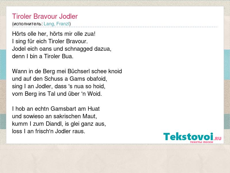 Hörts olle her, hörts mir olle zua! I sing für eich Tiroler Bravour. Jodel eich oans und schnagged dazua, denn I bin a Tiroler Bua. Wann in de Berg mei Büchserl schee knoid und auf den Schuss a Gams obafoid, sing I an Jodler, dass 's nua so hoid, vom Berg ins Tal und über 'n Woid. I hob an echtn Gamsbart am Huat und sowieso an sakrischen Maut, kumm I zum Diandl, is glei ganz aus, loss I an frisch'n Jodler raus.