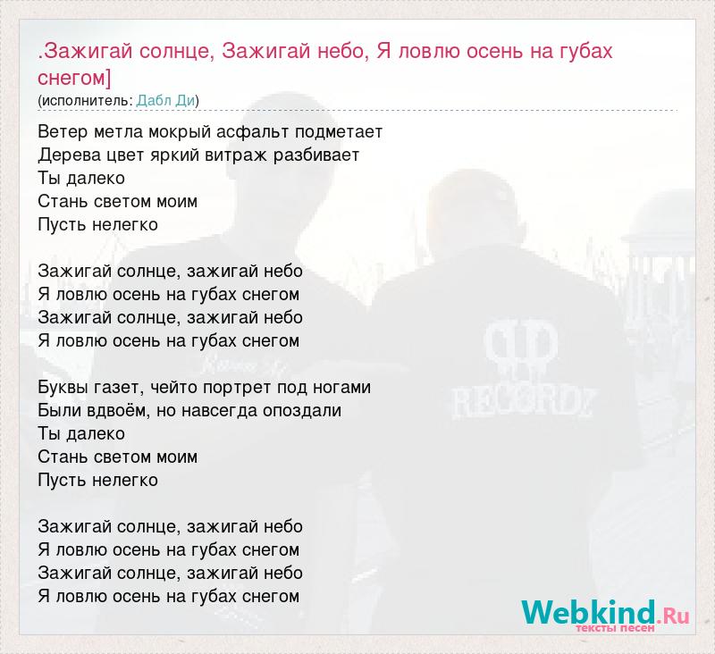 Ветер метла мокрый асфальт подметает Дерева цвет яркий витраж разбивает Ты далеко Стань светом моим Пусть нелегко Зажигай солнце, зажигай небо Я ловлю осень на губах снегoм Зажигай солнце, зажигай небо Я ловлю осень на губах снегом Буквы газет, чейто портрет под ногами Были вдвоём, но навсегда опоздали Ты далеко Стань светом моим Пусть нелегко Зажигай солнце, зажигай небо Я ловлю осень на губах снегoм Зажигай солнце, зажигай небо Я ловлю осень на губах снегом