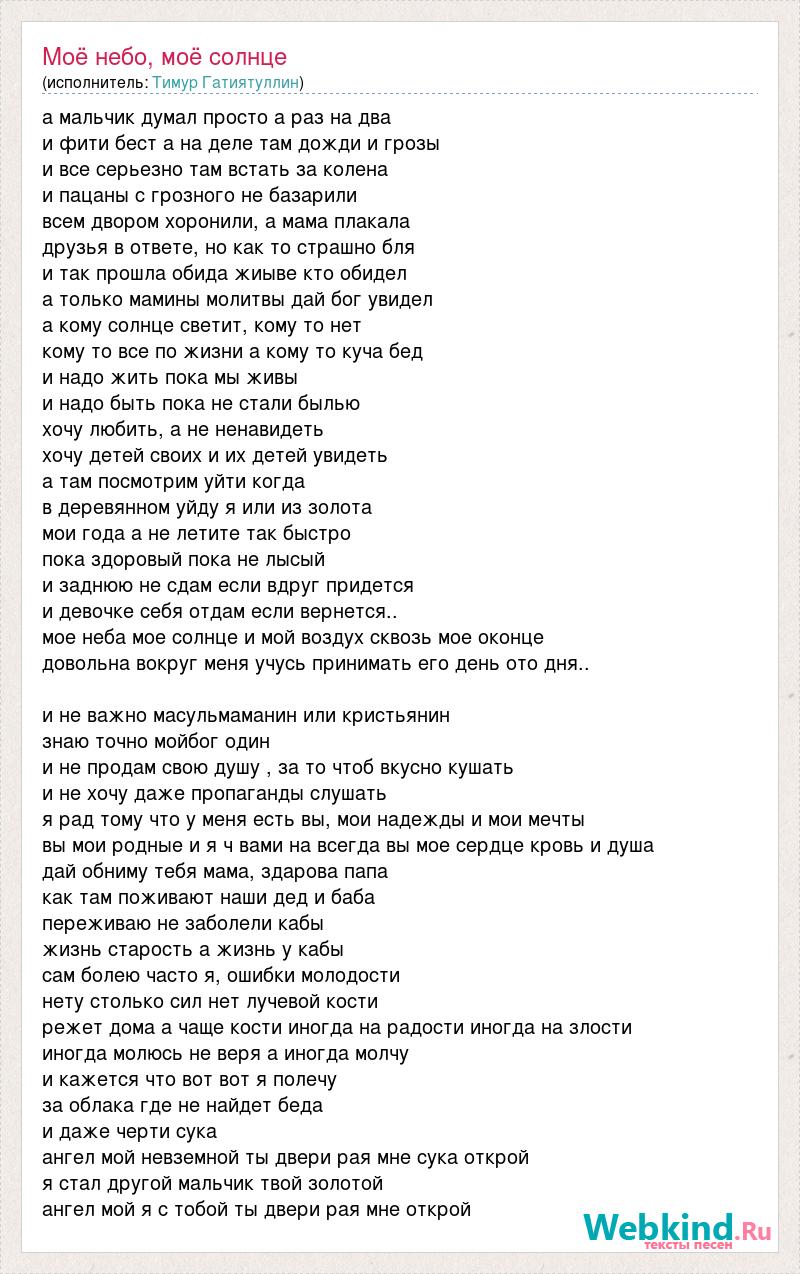 а мальчик думал просто а раз на два и фити бест а на деле там дожди и грозы и все серьезно там встать за колена и пацаны с грозного не базарили всем двором хоронили, а мама плакала друзья в ответе, но как то страшно бля и так прошла обида жиыве кто обидел а только мамины молитвы дай бог увидел а кому солнце светит, кому то нет кому то все по жизни а кому то куча бед и надо жить пока мы живы и надо быть пока не стали былью хочу любить, а не ненавидеть хочу детей своих и их детей увидеть а там посмотрим уйти когда в деревянном уйду я или из золота мои года а не летите так быстро пока здоровый пока не лысый и заднюю не сдам если вдруг придется и девочке себя отдам если вернется.. мое неба мое солнце и мой воздух сквозь мое оконце довольна вокруг меня учусь принимать его день ото дня.. и не важно масульмаманин или кристьянин знаю точно мойбог один и не продам свою душу , за то чтоб вкусно кушать и не хочу даже пропаганды слушать я рад тому что у меня есть вы, мои надежды и мои мечты вы мои родные и я ч вами на всегда вы мое сердце кровь и душа дай обниму тебя мама, здарова папа как там поживают наши дед и баба переживаю не заболели кабы жизнь старость а жизнь у кабы сам болею часто я, ошибки молодости нету столько сил нет лучевой кости режет дома а чаще кости иногда на радости иногда на злости иногда молюсь не веря а иногда молчу и кажется что вот вот я полечу за облака где не найдет беда и даже черти сука ангел мой невземной ты двери рая мне сука открой я стал другой мальчик твой золотой ангел мой я с тобой ты двери рая мне открой