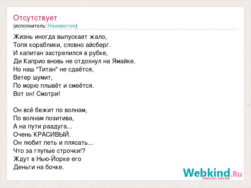 Жизнь иногда выпускает жало, Топя кораблики, словно айсберг. И капитан застрелился в рубке, Ди Каприо вновь не отдохнул на Ямайке. Но наш "Титан" не сдаётся, Ветер шумит, По морю плывёт и смеётся. Вот он! Смотри! Он всё бежит по волнам, По волнам позитива, А на пути раадуга... Очень КРАСИВЫЙ. Он любит петь и плясать... Что за глупые строчки!? Ждут в Нью-Йорке его Деньги на бочке.