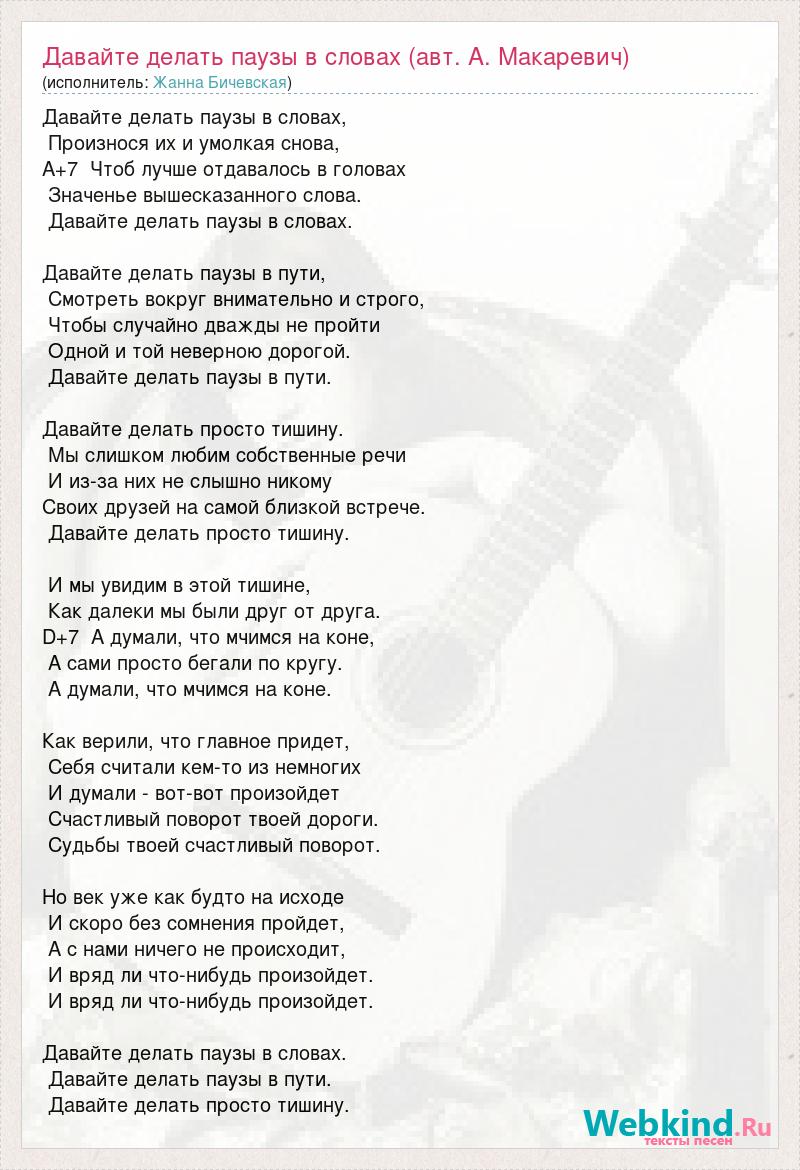 Давайте делать паузы в словах, Произнося их и умолкая снова, A+7 Чтоб лучше отдавалось в головах Значенье вышесказанного слова. Давайте делать паузы в словах. Давайте делать паузы в пути, Смотреть вокруг внимательно и строго, Чтобы случайно дважды не пройти Одной и той неверною дорогой. Давайте делать паузы в пути. Давайте делать просто тишину. Мы слишком любим собственные речи И из-за них не слышно никому Своих друзей на самой близкой встрече. Давайте делать просто тишину. И мы увидим в этой тишине, Как далеки мы были друг от друга. D+7 А думали, что мчимся на коне, А сами просто бегали по кругу. А думали, что мчимся на коне. Как верили, что главное придет, Себя считали кем-то из немногих И думали - вот-вот произойдет Счастливый поворот твоей дороги. Судьбы твоей счастливый поворот. Но век уже как будто на исходе И скоро без сомнения пройдет, А с нами ничего не происходит, И вряд ли что-нибудь произойдет. И вряд ли что-нибудь произойдет. Давайте делать паузы в словах. Давайте делать паузы в пути. Давайте делать просто тишину.