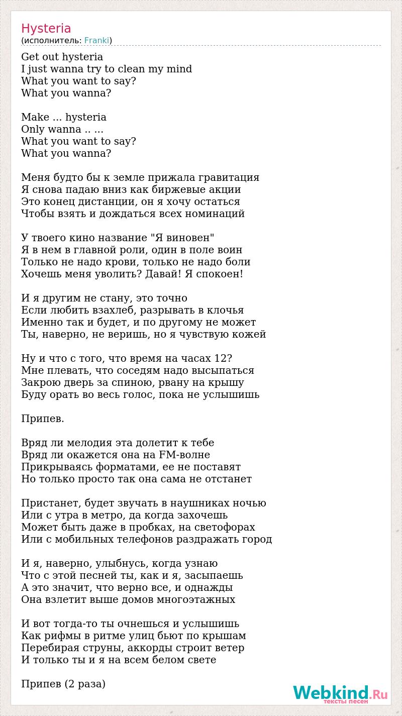 Get out hysteria I just wanna try to clean my mind What you want to say? What you wanna? Make ... hysteria Only wanna .. ... What you want to say? What you wanna? Меня будто бы к земле прижала гравитация Я снова падаю вниз как биржевые акции Это конец дистанции, он я хочу остаться Чтобы взять и дождаться всех номинаций У твоего кино название "Я виновен" Я в нем в главной роли, один в поле воин Только не надо крови, только не надо боли Хочешь меня уволить? Давай! Я спокоен! И я другим не стану, это точно Если любить взахлеб, разрывать в клочья Именно так и будет, и по другому не может Ты, наверно, не веришь, но я чувствую кожей Ну и что с того, что время на часах 12? Мне плевать, что соседям надо высыпаться Закрою дверь за спиною, рвану на крышу Буду орать во весь голос, пока не услышишь Припев. Вряд ли мелодия эта долетит к тебе Вряд ли окажется она на FM-волне Прикрываясь форматами, ее не поставят Но только просто так она сама не отстанет Пристанет, будет звучать в наушниках ночью Или с утра в метро, да когда захочешь Может быть даже в пробках, на светофорах Или с мобильных телефонов раздражать город И я, наверно, улыбнусь, когда узнаю Что с этой песней ты, как и я, засыпаешь А это значит, что верно все, и однажды Она взлетит выше домов многоэтажных И вот тогда-то ты очнешься и услышишь Как рифмы в ритме улиц бьют по крышам Перебирая струны, аккорды строит ветер И только ты и я на всем белом свете Припев (2 раза)