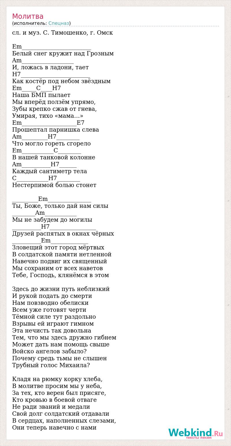 сл. и муз. С. Тимошенко, г. Омск Em________________________ Белый снег кружит над Грозным Am__________________ И, ложась в ладони, тает H7________________________ Как костёр под небом звёздным Em_____C____H7 Наша БМП пылает Мы вперёд ползём упрямо, Зубы крепко сжав от гнева, Умирая, тихо «мама…» Em___________________E7 Прошептал парнишка слева Am_________H7________ Что могло гореть сгорело Em___________C________ В нашей танковой колонне Am__________H7______ Каждый сантиметр тела C___________H7________ Нестерпимой болью стонет _________Em_______________ Ты, Боже, только дай нам силы ________Am___________ Мы не забудем до могилы __________H7________________ Друзей распятых в окнах чёрных __________Em_____________ Зловещий этот город мёртвых В солдатской памяти нетленной Навечно подвиг их священный Мы сохраним от всех наветов Тебе, Господь, клянёмся в этом Здесь до жизни путь неблизкий И рукой подать до смерти Нам повзводно обелиски Всем уже готовят черти Тёмной силе тут раздольно Взрывы ей играют гимном Эта нечисть так довольна Тем, что мы здесь дружно гибнем Может дать нам помощь свыше Войско ангелов забыло? Почему средь тьмы не слышен Трубный голос Михаила? Кладя на рюмку корку хлеба, В молитве просим мы у неба, За тех, кто верен был присяге, Кто кровью в боевой отваге Не ради званий и медали Свой долг солдатский отдавали В сердцах, наполненных слезами, Они теперь навечно с нами