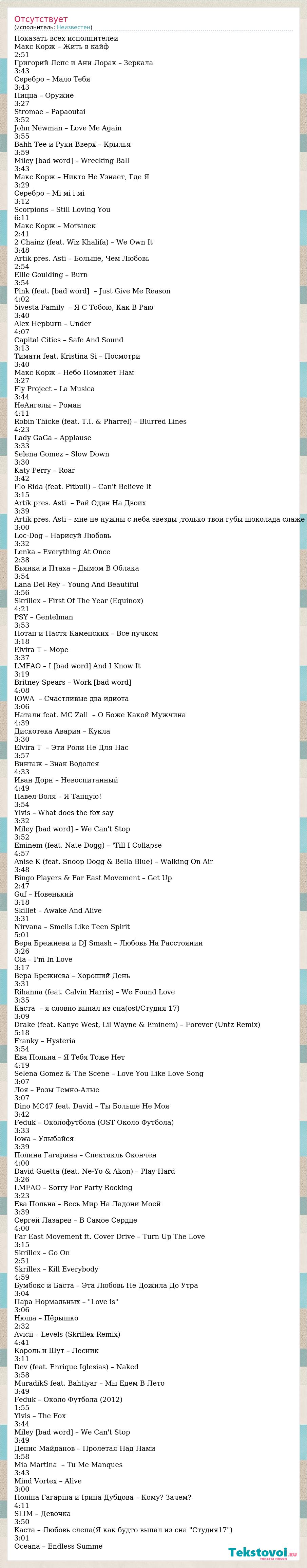 Показать всех исполнителей Макс Корж – Жить в кайф 2:51 Григорий Лепс и Ани Лорак – Зеркала 3:43 Серебро – Мало Тебя 3:43 Пицца – Оружие 3:27 Stromae – Papaoutai 3:52 John Newman – Love Me Again 3:55 Bahh Tee и Руки Вверх – Крылья 3:59 Miley Cyrus – Wrecking Ball 3:43 Макс Корж – Никто Не Узнает, Где Я 3:29 Серебро – Мі мі і мі 3:12 Scorpions – Still Loving You 6:11 Макс Корж – Мотылек 2:41 2 Chainz (feat. Wiz Khalifa) – We Own It 3:48 Artik pres. Asti – Больше, Чем Любовь 2:54 Ellie Goulding – Burn 3:54 Pink (feat. Nate Ruess) – Just Give Me Reason 4:02 5ivesta Family – Я С Тобою, Как В Раю 3:40 Alex Hepburn – Under 4:07 Capital Cities – Safe And Sound 3:13 Тимати feat. Kristina Si – Посмотри 3:40 Макс Корж – Небо Поможет Нам 3:27 Fly Project – La Musica 3:44 НеАнгелы – Роман 4:11 Robin Thicke (feat. T.I. & Pharrel) – Blurred Lines 4:23 Lady GaGa – Applause 3:33 Selena Gomez – Slow Down 3:30 Katy Perry – Roar 3:42 Flo Rida (feat. Pitbull) – Can't Believe It 3:15 Artik pres. Asti – Рай Один На Двоих 3:39 Artik pres. Asti – мне не нужны с неба звезды ,только твои губы шоколада слаже 3:00 Loc-Dog – Нарисуй Любовь 3:32 Lenka – Everything At Once 2:38 Бьянка и Птаха – Дымом В Облака 3:54 Lana Del Rey – Young And Beautiful 3:56 Skrillex – First Of The Year (Equinox) 4:21 PSY – Gentelman 3:53 Потап и Настя Каменских – Все пучком 3:18 Elvira T – Море 3:37 LMFAO – I Sexy And I Know It 3:19 Britney Spears – Work Bitch 4:08 IOWA – Счастливые два идиота 3:06 Натали feat. MC Zali – О Боже Какой Мужчина 4:39 Дискотека Авария – Кукла 3:30 Elvira T – Эти Роли Не Для Нас 3:57 Винтаж – Знак Водолея 4:33 Иван Дорн – Невоспитанный 4:49 Павел Воля – Я Танцую! 3:54 Ylvis – What does the fox say 3:32 Miley Cyrus – We Can't Stop 3:52 Eminem (feat. Nate Dogg) – 'Till I Collapse 4:57 Anise K (feat. Snoop Dogg & Bella Blue) – Walking On Air 3:48 Bingo Players & Far East Movement – Get Up 2:47 Guf – Новенький 3:18 Skillet – Awake And Alive 3:31 Nirvana – Smells Like Teen Spirit 5:01 Вера Брежнева и DJ Smash – Любовь На Расстоянии 3:26 Ola – I'm In Love 3:17 Вера Брежнева – Хороший День 3:31 Rihanna (feat. Calvin Harris) – We Found Love 3:35 Каста – я словно выпал из сна(ost/Студия 17) 3:09 Drake (feat. Kanye West, Lil Wayne & Eminem) – Forever (Untz Remix) 5:18 Franky – Hysteria 3:54 Ева Польна – Я Тебя Тоже Нет 4:19 Selena Gomez & The Scene – Love You Like Love Song 3:07 Лоя – Розы Темно-Алые 3:07 Dino MC47 feat. David – Ты Больше Не Моя 3:42 Feduk – Околофутбола (OST Около Футбола) 3:33 Iowa – Улыбайся 3:39 Полина Гагарина – Спектакль Окончен 4:00 David Guetta (feat. Ne-Yo & Akon) – Play Hard 3:26 LMFAO – Sorry For Party Rocking 3:23 Ева Польна – Весь Мир На Ладони Моей 3:39 Сергей Лазарев – В Самое Сердце 4:00 Far East Movement ft. Cover Drive – Turn Up The Love 3:15 Skrillex – Go On 2:51 Skrillex – Kill Everybody 4:59 Бумбокс и Баста – Эта Любовь Не Дожила До Утра 3:04 Пара Нормальных – "Love is" 3:06 Нюша – Пёрышко 2:32 Avicii – Levels (Skrillex Remix) 4:41 Король и Шут – Лесник 3:11 Dev (feat. Enrique Iglesias) – Naked 3:58 MuradikS feat. Bahtiyar – Мы Едем В Лето 3:49 Feduk – Около Футбола (2012) 1:55 Ylvis – The Fox 3:44 Miley Cyrus – We Can't Stop 3:49 Денис Майданов – Пролетая Над Нами 3:58 Mia Martina – Tu Me Manques 3:43 Mind Vortex – Alive 3:00 Поліна Гагаріна и Ірина Дубцова – Кому? Зачем? 4:11 SLIM – Девочка 3:50 Каста – Любовь слепа(Я как будто выпал из сна "Студия17") 3:01 Oceana – Endless Summe