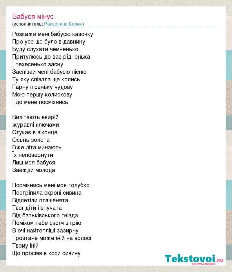 Розкажи мені бабусю казочку Про усе що було в давнину Буду слухати чемненько Притулюсь до вас рідненька І техесенько засну Заспівай мені бабусю пісню Ту яку співала ще колись Гарну пісеньку чудову Мою першу колискову І до мене посміхнись Вилітають ввирій журавлі ключами Стукає в віконце Осьнь золота Вже літа минають Їх неповернути Лиш моя бабуся Завжди молода Посміхнись мені моя голубко Постріпила скроні сивина Відлетіли пташенята Твої діти і внучата Від батьківського гнізда Поміхом тебе своїм зігрію В очі найтепліші зазирну І розтане може іній на волосі Твому іній Що просіяв в коси сивину