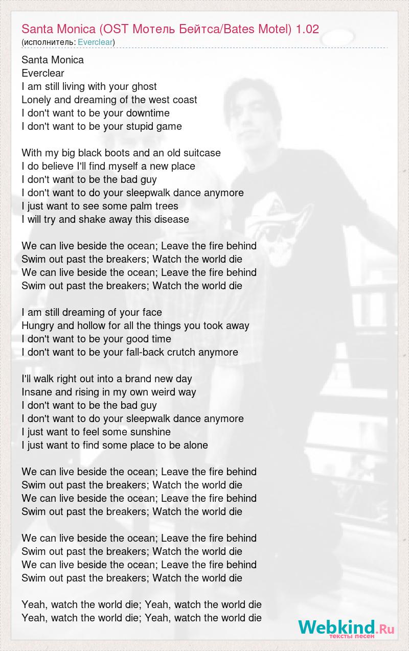 Santa Monica Everclear I am still living with your ghost Lonely and dreaming of the west coast I don't want to be your downtime I don't want to be your stupid game With my big black boots and an old suitcase I do believe I'll find myself a new place I don't want to be the bad guy I don't want to do your sleepwalk dance anymore I just want to see some palm trees I will try and shake away this disease We can live beside the ocean; Leave the fire behind Swim out past the breakers; Watch the world die We can live beside the ocean; Leave the fire behind Swim out past the breakers; Watch the world die I am still dreaming of your face Hungry and hollow for all the things you took away I don't want to be your good time I don't want to be your fall-back crutch anymore I'll walk right out into a brand new day Insane and rising in my own weird way I don't want to be the bad guy I don't want to do your sleepwalk dance anymore I just want to feel some sunshine I just want to find some place to be alone We can live beside the ocean; Leave the fire behind Swim out past the breakers; Watch the world die We can live beside the ocean; Leave the fire behind Swim out past the breakers; Watch the world die We can live beside the ocean; Leave the fire behind Swim out past the breakers; Watch the world die We can live beside the ocean; Leave the fire behind Swim out past the breakers; Watch the world die Yeah, watch the world die; Yeah, watch the world die Yeah, watch the world die; Yeah, watch the world die