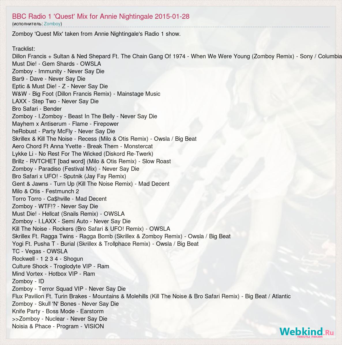 Zomboy 'Quest Mix' taken from Annie Nightingale's Radio 1 show. Tracklist: Dillon Francis + Sultan & Ned Shepard Ft. The Chain Gang Of 1974 - When We Were Young (Zomboy Remix) - Sony / Columbia Must Die! - Gem Shards - OWSLA Zomboy - Immunity - Never Say Die Bar9 - Dave - Never Say Die Eptic & Must Die! - Z - Never Say Die W&W - Big Foot (Dillon Francis Remix) - Mainstage Music LAXX - Step Two - Never Say Die Bro Safari - Bender Zomboy - I.Zomboy - Beast In The Belly - Never Say Die Mayhem x Antiserum - Flame - Firepower heRobust - Party McFly - Never Say Die Skrillex & Kill The Noise - Recess (Milo & Otis Remix) - Owsla / Big Beat Aero Chord Ft Anna Yvette - Break Them - Monstercat Lykke Li - No Rest For The Wicked (Diskord Re-Twerk) Brillz - RVTCHET [bad word] (Milo & Otis Remix) - Slow Roast Zomboy - Paradiso (Festival Mix) - Never Say Die Bro Safari x UFO! - Sputnik (Jay Fay Remix) Gent & Jawns - Turn Up (Kill The Noise Remix) - Mad Decent Milo & Otis - Festmunch 2 Torro Torro - Ca$hville - Mad Decent Zomboy - WTF!? - Never Say Die Must Die! - Hellcat (Snails Remix) - OWSLA Zomboy - I.LAXX - Semi Auto - Never Say Die Kill The Noise - Rockers (Bro Safari & UFO! Remix) - OWSLA Skrillex Ft. Ragga Twins - Ragga Bomb (Skrillex & Zomboy Remix) - Owsla / Big Beat Yogi Ft. Pusha T - Burial (Skrillex & Trollphace Remix) - Owsla / Big Beat TC - Vegas - OWSLA Rockwell - 1 2 3 4 - Shogun Culture Shock - Troglodyte VIP - Ram Mind Vortex - Hotbox VIP - Ram Zomboy - ID Zomboy - Terror Squad VIP - Never Say Die Flux Pavilion Ft. Turin Brakes - Mountains & Molehills (Kill The Noise & Bro Safari Remix) - Big Beat / Atlantic Zomboy - Skull 'N' Bones - Never Say Die Knife Party - Boss Mode - Earstorm >>Zomboy - Nuclear - Never Say Die Noisia & Phace - Program - VISION