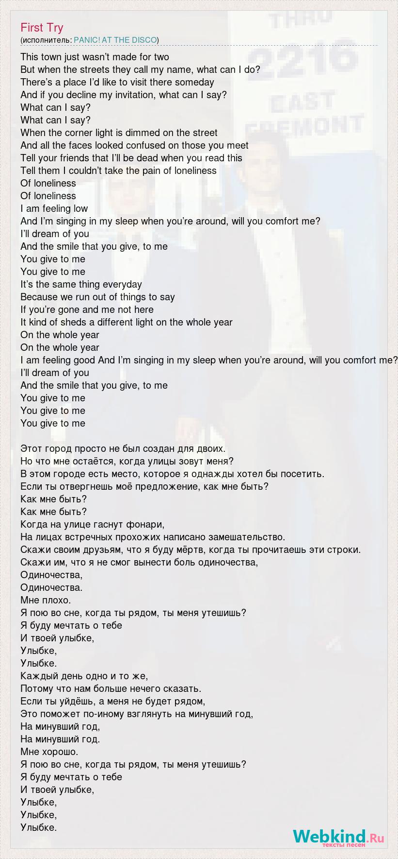This town just wasn’t made for two But when the streets they call my name, what can I do? There’s a place I’d like to visit there someday And if you decline my invitation, what can I say? What can I say? What can I say? When the corner light is dimmed on the street And all the faces looked confused on those you meet Tell your friends that I’ll be dead when you read this Tell them I couldn’t take the pain of loneliness Of loneliness Of loneliness I am feeling low And I’m singing in my sleep when you’re around, will you comfort me? I’ll dream of you And the smile that you give, to me You give to me You give to me It’s the same thing everyday Because we run out of things to say If you’re gone and me not here It kind of sheds a different light on the whole year On the whole year On the whole year I am feeling good And I’m singing in my sleep when you’re around, will you comfort me? I’ll dream of you And the smile that you give, to me You give to me You give to me You give to me Этот город просто не был создан для двоих. Но что мне остаётся, когда улицы зовут меня? В этом городе есть место, которое я однажды хотел бы посетить. Если ты отвергнешь моё предложение, как мне быть? Как мне быть? Как мне быть? Когда на улице гаснут фонари, На лицах встречных прохожих написано замешательство. Скажи своим друзьям, что я буду мёртв, когда ты прочитаешь эти строки. Скажи им, что я не смог вынести боль одиночества, Одиночества, Одиночества. Мне плохо. Я пою во сне, когда ты рядом, ты меня утешишь? Я буду мечтать о тебе И твоей улыбке, Улыбке, Улыбке. Каждый день одно и то же, Потому что нам больше нечего сказать. Если ты уйдёшь, а меня не будет рядом, Это поможет по-иному взглянуть на минувший год, На минувший год, На минувший год. Мне хорошо. Я пою во сне, когда ты рядом, ты меня утешишь? Я буду мечтать о тебе И твоей улыбке, Улыбке, Улыбке, Улыбке.