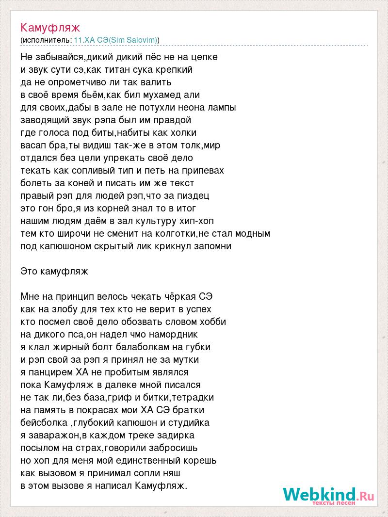 Не забывайся,дикий дикий пёс не на цепке и звук сути сэ,как титан сука крепкий да не опрометчиво ли так валить в своё время бьём,как бил мухамед али для своих,дабы в зале не потухли неона лампы заводящий звук рэпа был им правдой где голоса под биты,набиты как холки васап бра,ты видиш так-же в этом толк,мир отдался без цели упрекать своё дело текать как сопливый тип и петь на припевах болеть за коней и писать им же текст правый рэп для людей рэп,что за пиздец это гон бро,я из корней знал то в итог нашим людям даём в зал культуру хип-хоп тем кто широчи не сменит на колготки,не стал модным под капюшоном скрытый лик крикнул запомни Это камуфляж Мне на принцип велось чекать чёркая СЭ как на злобу для тех кто не верит в успех кто посмел своё дело обозвать словом хобби на дикого пса,он надел чмо намордник я клал жирный болт балаболкам на губки и рэп свой за рэп я принял не за мутки я панцирем ХА не пробитым являлся пока Камуфляж в далеке мной писался не так ли,без база,гриф и битки,тетрадки на память в покрасах мои ХА СЭ братки бейсболка ,глубокий капюшон и студийка я заваражон,в каждом треке задирка посылом на страх,говорили забросишь но хоп для меня мой единственный корешь как вызовом я принимал сопли няш в этом вызове я написал Камуфляж.