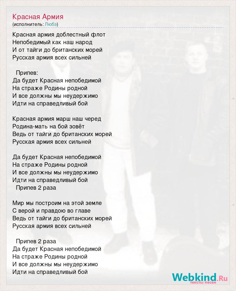 Красная армия доблестный флот Непобедимый как наш народ И от тайги до британских морей Русская армия всех сильней Припев: Да будет Красная непобедимой На страже Родины родной И все должны мы неудержимо Идти на справедливый бой Красная армия марш наш черед Родина-мать на бой зовёт Ведь от тайги до британских морей Русская армия всех сильней Да будет Красная непобедимой На страже Родины родной И все должны мы неудержимо Идти на справедливый бой Припев 2 раза Мир мы построим на этой земле С верой и правдою во главе Ведь от тайги до британских морей Русская армия всех сильней Припев 2 раза Да будет Красная непобедимой На страже Родины родной И все должны мы неудержимо Идти на справедливый бой