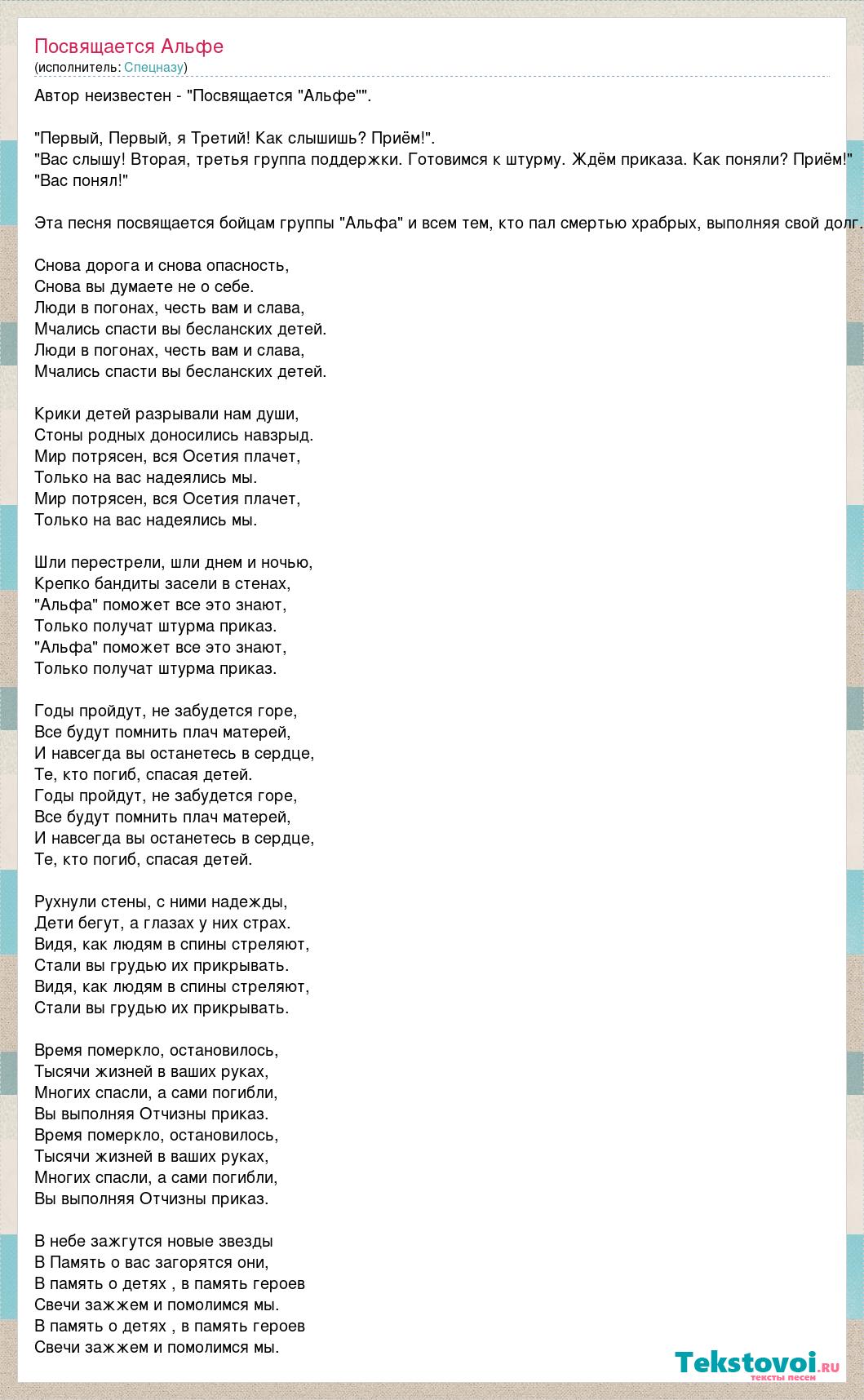 Автор неизвестен - "Посвящается "Альфе"". "Первый, Первый, я Третий! Как слышишь? Приём!". "Вас слышу! Вторая, третья группа поддержки. Готовимся к штурму. Ждём приказа. Как поняли? Приём!" "Вас понял!" Эта песня посвящается бойцам группы "Альфа" и всем тем, кто пал смертью храбрых, выполняя свой долг. Снова дорога и снова опасность, Снова вы думаете не о себе. Люди в погонах, честь вам и слава, Мчались спасти вы бесланских детей. Люди в погонах, честь вам и слава, Мчались спасти вы бесланских детей. Крики детей разрывали нам души, Стоны родных доносились навзрыд. Мир потрясен, вся Осетия плачет, Только на вас надеялись мы. Мир потрясен, вся Осетия плачет, Только на вас надеялись мы. Шли перестрели, шли днем и ночью, Крепко бандиты засели в стенах, "Альфа" поможет все это знают, Только получат штурма приказ. "Альфа" поможет все это знают, Только получат штурма приказ. Годы пройдут, не забудется горе, Все будут помнить плач матерей, И навсегда вы останетесь в сердце, Те, кто погиб, спасая детей. Годы пройдут, не забудется горе, Все будут помнить плач матерей, И навсегда вы останетесь в сердце, Те, кто погиб, спасая детей. Рухнули стены, с ними надежды, Дети бегут, а глазах у них страх. Видя, как людям в спины стреляют, Стали вы грудью их прикрывать. Видя, как людям в спины стреляют, Стали вы грудью их прикрывать. Время померкло, остановилось, Тысячи жизней в ваших руках, Многих спасли, а сами погибли, Вы выполняя Отчизны приказ. Время померкло, остановилось, Тысячи жизней в ваших руках, Многих спасли, а сами погибли, Вы выполняя Отчизны приказ. В небе зажгутся новые звезды В Память о вас загорятся они, В память о детях , в память героев Свечи зажжем и помолимся мы. В память о детях , в память героев Свечи зажжем и помолимся мы.