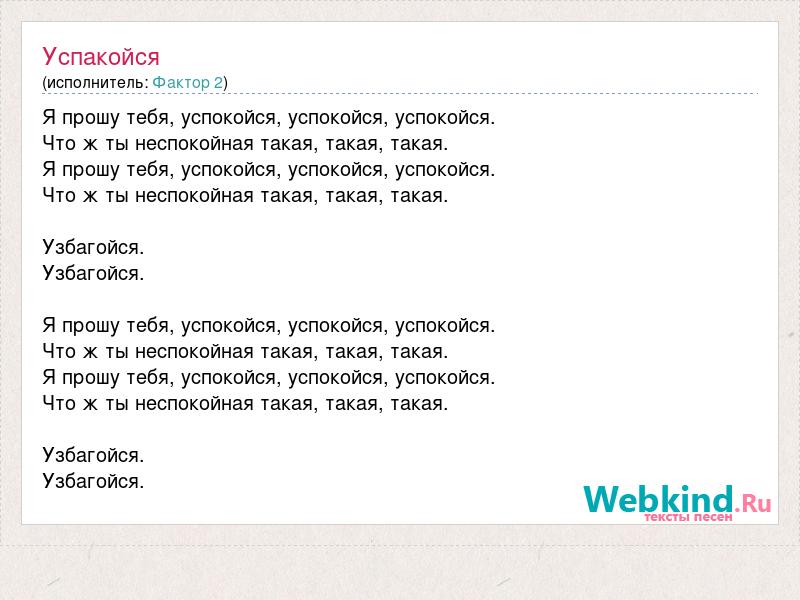 Я прошу тебя, успокойся, успокойся, успокойся. Что ж ты неспокойная такая, такая, такая. Я прошу тебя, успокойся, успокойся, успокойся. Что ж ты неспокойная такая, такая, такая. Узбагойся. Узбагойся. Я прошу тебя, успокойся, успокойся, успокойся. Что ж ты неспокойная такая, такая, такая. Я прошу тебя, успокойся, успокойся, успокойся. Что ж ты неспокойная такая, такая, такая. Узбагойся. Узбагойся.