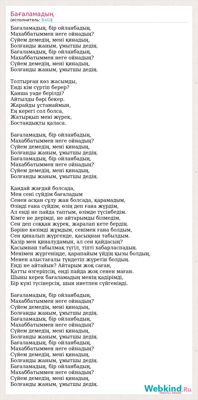 Бағаламадың, бір ойланбадың, Махаббатыммен неге ойнадың? Сүйем демедің, мені қинадың, Болғанды жаным, ұмытшы дедің. Бағаламадың, бір ойланбадың, Махаббатыммен неге ойнадың? Сүйем демедің, мені қинадың, Болғанды жаным, ұмытшы дедің. Толтырған көз жасымды, Енді кім сүртіп берер? Қанша уәде берілді? Айтылды бәрі бекер. Жарайды ұстамаймын, Ең керегі сол болса, Жатырқып мені жүрек, Бостандықты қаласа. Бағаламадың, бір ойланбадың, Махаббатыммен неге ойнадың? Сүйем демедің, мені қинадың, Болғанды жаным, ұмытшы дедің. Бағаламадың, бір ойланбадың, Махаббатыммен неге ойнадың? Сүйем демедің, мені қинадың, Болғанды жаным, ұмытшы дедің. Қандай жағдай болсада, Мен сені сүйдім бағаладым Сенен асқан сұлу жан болсада, қарамадым, Өзіңді ғана сүйдім, өзің деп ғана жүрдім, Ал енді не пайда таптым, өзімде түсінбедім. Кімге не дерімді, не айтарымды білмедім, Сен деп соққан жүрек, жаралап кете бердің. Бәріне көзімді жұмдым, сенімен ғана болдым, Сен қиналып жүргенде, қасыңнан табылдым. Қазір мен қиналудамын, ал сен қайдасың? Қасымнан табылмақ түгіл, тіпті хабарласпадың. Менімен жүргеніңде, қарапайым үйдің қызы болдың, Менен алыстағалы түндетіп жүретін болдың. Енді не айтайын? Айтарым жоқ саған, Қатты өзгеріпсің, енді пайда жоқ сенен маған. Шыны керек бағаламадың менің қадірімді, Бір күні түсінерсің, шын ниетпен сүйгеніңді. Бағаламадың, бір ойланбадың, Махаббатыммен неге ойнадың? Сүйем демедің, мені қинадың, Болғанды жаным, ұмытшы дедің. Бағаламадың, бір ойланбадың, Махаббатыммен неге ойнадың? Сүйем демедің, мені қинадың, Болғанды жаным, ұмытшы дедің. Бағаламадың, бір ойланбадың, Махаббатыммен неге ойнадың? Сүйем демедің, мені қинадың, Болғанды жаным, ұмытшы дедің. Бағаламадың, бір ойланбадың, Махаббатыммен неге ойнадың? Сүйем демедің, мені қинадың, Болғанды жаным, ұмытшы дедің.