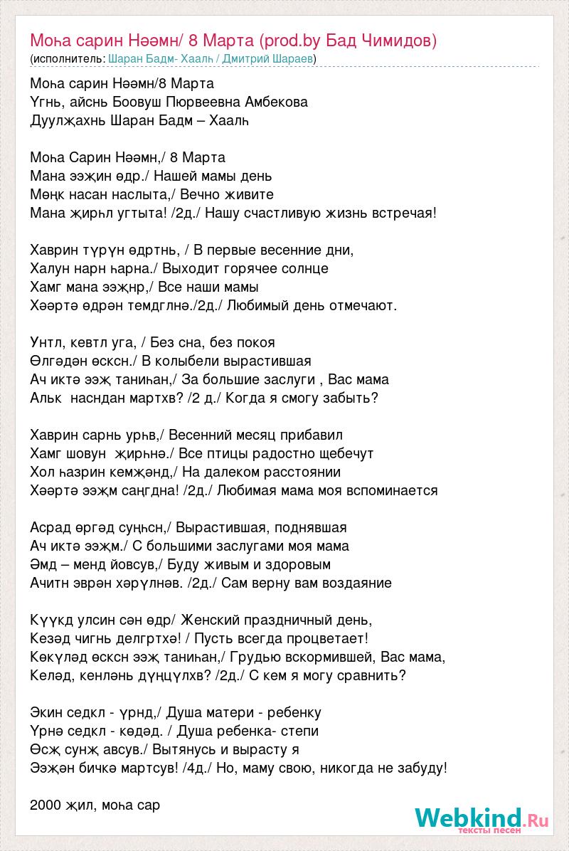 Моһа сарин Нәәмн/8 Марта Үгнь, айснь Боовуш Пюрвеевна Амбекова Дуулҗахнь Шаран Бадм – Хаалһ Моһа Сарин Нәәмн,/ 8 Марта Мана ээҗин өдр./ Нашей мамы день Мөңк насан наслыта,/ Вечно живите Мана җирһл угтыта! /2д./ Нашу счастливую жизнь встречая! Хаврин түрүн өдртнь, / В первые весенние дни, Халун нарн һарна./ Выходит горячее солнце Хамг мана ээҗнр,/ Все наши мамы Хәәртә өдрән темдглнә./2д./ Любимый день отмечают. Унтл, кевтл уга, / Без сна, без покоя Өлгәдән өсксн./ В колыбели вырастившая Ач иктә ээҗ таниһан,/ За большие заслуги , Вас мама Альк насндан мартхв? /2 д./ Когда я смогу забыть? Хаврин сарнь урһв,/ Весенний месяц прибавил Хамг шовун җирһнә./ Все птицы радостно щебечут Хол һазрин кемҗәнд,/ На далеком расстоянии Хәәртә ээҗм саңгдна! /2д./ Любимая мама моя вспоминается Асрад өргәд суңһсн,/ Вырастившая, поднявшая Ач иктә ээҗм./ С большими заслугами моя мама Әмд – менд йовсув,/ Буду живым и здоровым Ачитн эврән хәрүлнәв. /2д./ Сам верну вам воздаяние Күүкд улсин сән өдр/ Женский праздничный день, Кезәд чигнь делгртхә! / Пусть всегда процветает! Көкүләд өсксн ээҗ таниһан,/ Грудью вскормившей, Вас мама, Келәд, кенләнь дүңцүлхв? /2д./ С кем я могу сравнить? Экин седкл - үрнд,/ Душа матери - ребенку Үрнә седкл - көдәд. / Душа ребенка- степи Өсҗ сунҗ авсув./ Вытянусь и вырасту я Ээҗән бичкә мартсув! /4д./ Но, маму свою, никогда не забуду! 2000 җил, моһа сар