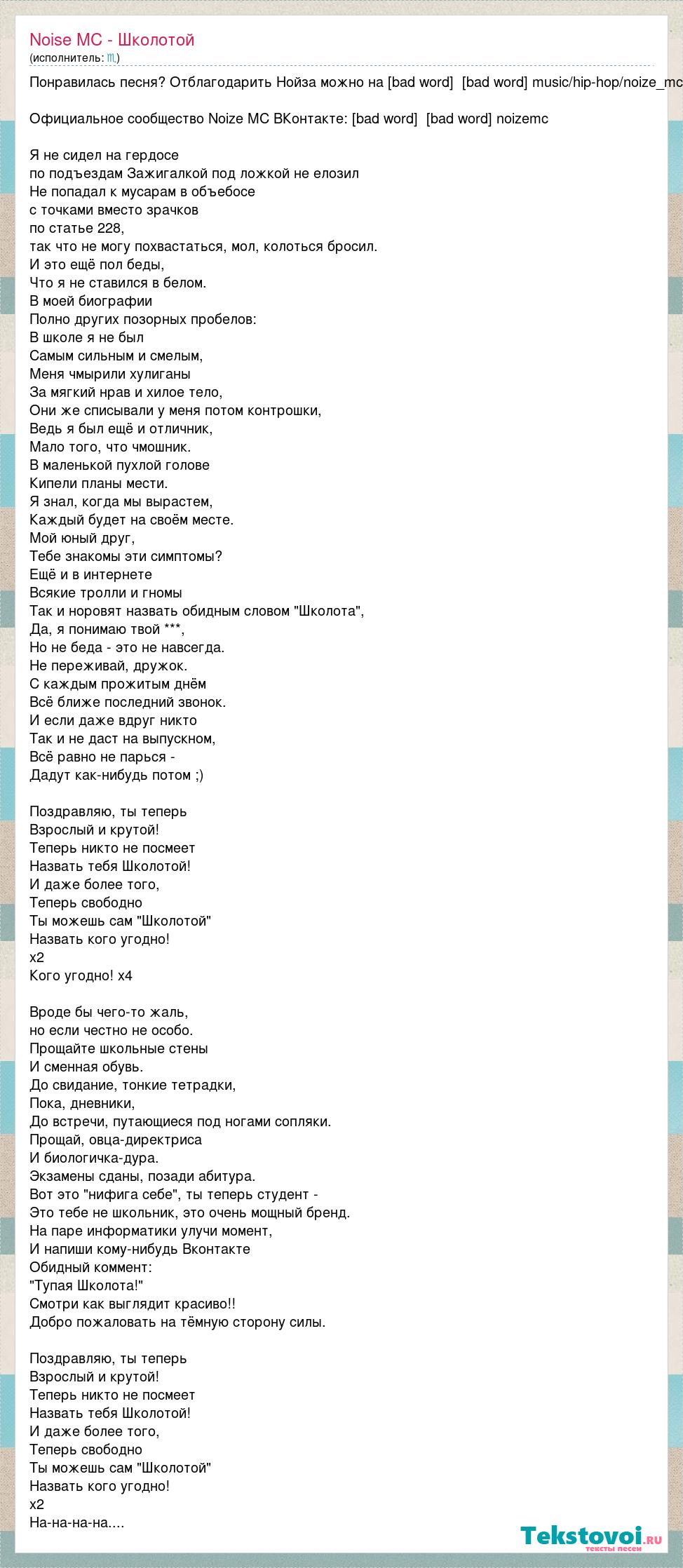 Понравилась песня? Отблагодарить Нойза можно на [bad word] [bad word] music/hip-hop/noize_mc Официальное сообщество Noize MC ВКонтакте: [bad word] [bad word] noizemc Я не сидел на гердосе по подъездам Зажигалкой под ложкой не елозил Не попадал к мусарам в объебосе с точками вместо зрачков по статье 228, так что не могу похвастаться, мол, колоться бросил. И это ещё пол беды, Что я не ставился в белом. В моей биографии Полно других позорных пробелов: В школе я не был Самым сильным и смелым, Меня чмырили хулиганы За мягкий нрав и хилое тело, Они же списывали у меня потом контрошки, Ведь я был ещё и отличник, Мало того, что чмошник. В маленькой пухлой голове Кипели планы мести. Я знал, когда мы вырастем, Каждый будет на своём месте. Мой юный друг, Тебе знакомы эти симптомы? Ещё и в интернете Всякие тролли и гномы Так и норовят назвать обидным словом "Школота", Да, я понимаю твой ***, Но не беда - это не навсегда. Не переживай, дружок. С каждым прожитым днём Всё ближе последний звонок. И если даже вдруг никто Так и не даст на выпускном, Всё равно не парься - Дадут как-нибудь потом ;) Поздравляю, ты теперь Взрослый и крутой! Теперь никто не посмеет Назвать тебя Школотой! И даже более того, Теперь свободно Ты можешь сам "Школотой" Назвать кого угодно! x2 Кого угодно! x4 Вроде бы чего-то жаль, но если честно не особо. Прощайте школьные стены И сменная обувь. До свидание, тонкие тетрадки, Пока, дневники, До встречи, путающиеся под ногами сопляки. Прощай, овца-директриса И биологичка-дура. Экзамены сданы, позади абитура. Вот это "нифига себе", ты теперь студент - Это тебе не школьник, это очень мощный бренд. На паре информатики улучи момент, И напиши кому-нибудь Вконтакте Обидный коммент: "Тупая Школота!" Смотри как выглядит красиво!! Добро пожаловать на тёмную сторону силы. Поздравляю, ты теперь Взрослый и крутой! Теперь никто не посмеет Назвать тебя Школотой! И даже более того, Теперь свободно Ты можешь сам "Школотой" Назвать кого угодно! x2 На-на-на-на....