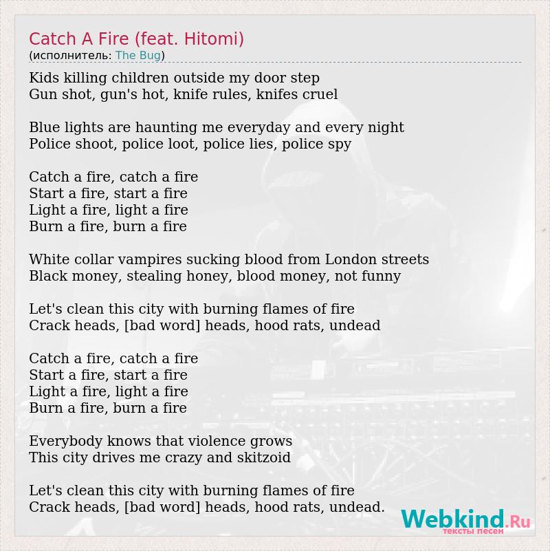 Kids killing children outside my door step Gun shot, gun's hot, knife rules, knifes cruel Blue lights are haunting me everyday and every night Police shoot, police loot, police lies, police spy Catch a fire, catch a fire Start a fire, start a fire Light a fire, light a fire Burn a fire, burn a fire White collar vampires sucking blood from London streets Black money, stealing honey, blood money, not funny Let's clean this city with burning flames of fire Crack heads, [bad word] heads, hood rats, undead Catch a fire, catch a fire Start a fire, start a fire Light a fire, light a fire Burn a fire, burn a fire Everybody knows that violence grows This city drives me crazy and skitzoid Let's clean this city with burning flames of fire Crack heads, [bad word] heads, hood rats, undead.