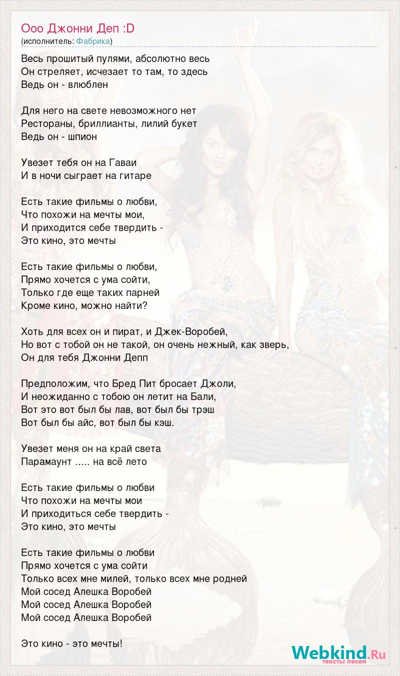 Весь прошитый пулями, абсолютно весь Он стреляет, исчезает то там, то здесь Ведь он - влюблен Для него на свете невозможного нет Рестораны, бриллианты, лилий букет Ведь он - шпион Увезет тебя он на Гаваи И в ночи сыграет на гитаре Есть такие фильмы о любви, Что похожи на мечты мои, И приходится себе твердить - Это кино, это мечты Есть такие фильмы о любви, Прямо хочется с ума сойти, Только где еще таких парней Кроме кино, можно найти? Хоть для всех он и пират, и Джек-Воробей, Но вот с тобой он не такой, он очень нежный, как зверь, Он для тебя Джонни Депп Предположим, что Бред Пит бросает Джоли, И неожиданно с тобою он летит на Бали, Вот это вот был бы лав, вот был бы трэш Вот был бы айс, вот был бы кэш. Увезет меня он на край света Парамаунт ..... на всё лето Есть такие фильмы о любви Что похожи на мечты мои И приходиться себе твердить - Это кино, это мечты Есть такие фильмы о любви Прямо хочется с ума сойти Только всех мне милей, только всех мне родней Мой сосед Алешка Воробей Мой сосед Алешка Воробей Мой сосед Алешка Воробей Это кино - это мечты!