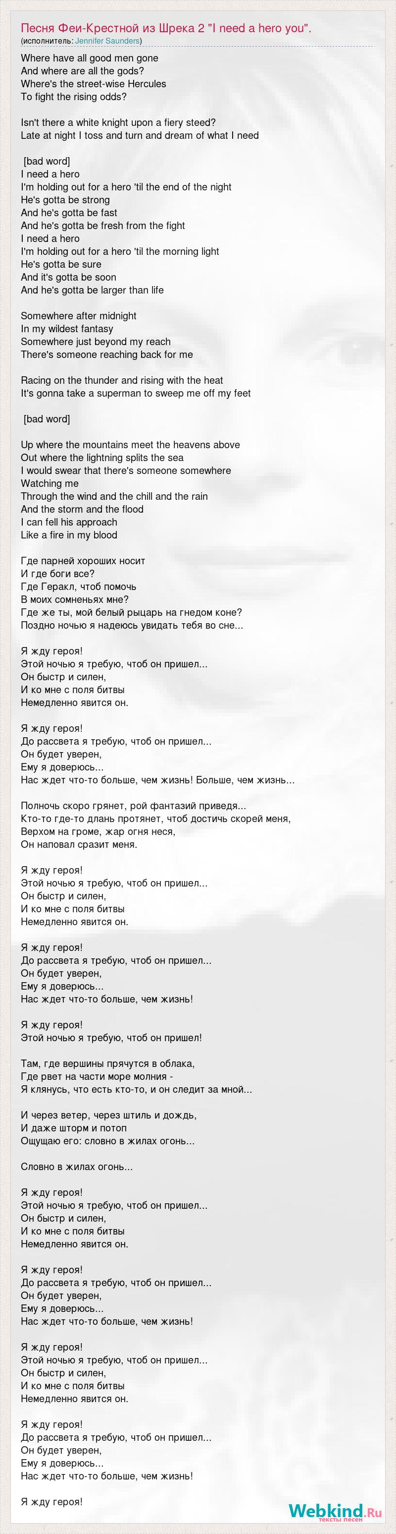 Where have all good men gone And where are all the gods? Where's the street-wise Hercules To fight the rising odds? Isn't there a white knight upon a fiery steed? Late at night I toss and turn and dream of what I need [bad word] I need a hero I'm holding out for a hero 'til the end of the night He's gotta be strong And he's gotta be fast And he's gotta be fresh from the fight I need a hero I'm holding out for a hero 'til the morning light He's gotta be sure And it's gotta be soon And he's gotta be larger than life Somewhere after midnight In my wildest fantasy Somewhere just beyond my reach There's someone reaching back for me Racing on the thunder and rising with the heat It's gonna take a superman to sweep me off my feet [bad word] Up where the mountains meet the heavens above Out where the lightning splits the sea I would swear that there's someone somewhere Watching me Through the wind and the chill and the rain And the storm and the flood I can fell his approach Like a fire in my blood Где парней хороших носит И где боги все? Где Геракл, чтоб помочь В моих сомненьях мне? Где же ты, мой белый рыцарь на гнедом коне? Поздно ночью я надеюсь увидать тебя во сне... Я жду героя! Этой ночью я требую, чтоб он пришел... Он быстр и силен, И ко мне с поля битвы Немедленно явится он. Я жду героя! До рассвета я требую, чтоб он пришел... Он будет уверен, Ему я доверюсь... Нас ждет что-то больше, чем жизнь! Больше, чем жизнь... Полночь скоро грянет, рой фантазий приведя... Кто-то где-то длань протянет, чтоб достичь скорей меня, Верхом на громе, жар огня неся, Он наповал сразит меня. Я жду героя! Этой ночью я требую, чтоб он пришел... Он быстр и силен, И ко мне с поля битвы Немедленно явится он. Я жду героя! До рассвета я требую, чтоб он пришел... Он будет уверен, Ему я доверюсь... Нас ждет что-то больше, чем жизнь! Я жду героя! Этой ночью я требую, чтоб он пришел! Там, где вершины прячутся в облака, Где рвет на части море молния - Я клянусь, что есть кто-то, и он следит за мной... И через ветер, через штиль и дождь, И даже шторм и потоп Ощущаю его: словно в жилах огонь... Словно в жилах огонь... Я жду героя! Этой ночью я требую, чтоб он пришел... Он быстр и силен, И ко мне с поля битвы Немедленно явится он. Я жду героя! До рассвета я требую, чтоб он пришел... Он будет уверен, Ему я доверюсь... Нас ждет что-то больше, чем жизнь! Я жду героя! Этой ночью я требую, чтоб он пришел... Он быстр и силен, И ко мне с поля битвы Немедленно явится он. Я жду героя! До рассвета я требую, чтоб он пришел... Он будет уверен, Ему я доверюсь... Нас ждет что-то больше, чем жизнь! Я жду героя!