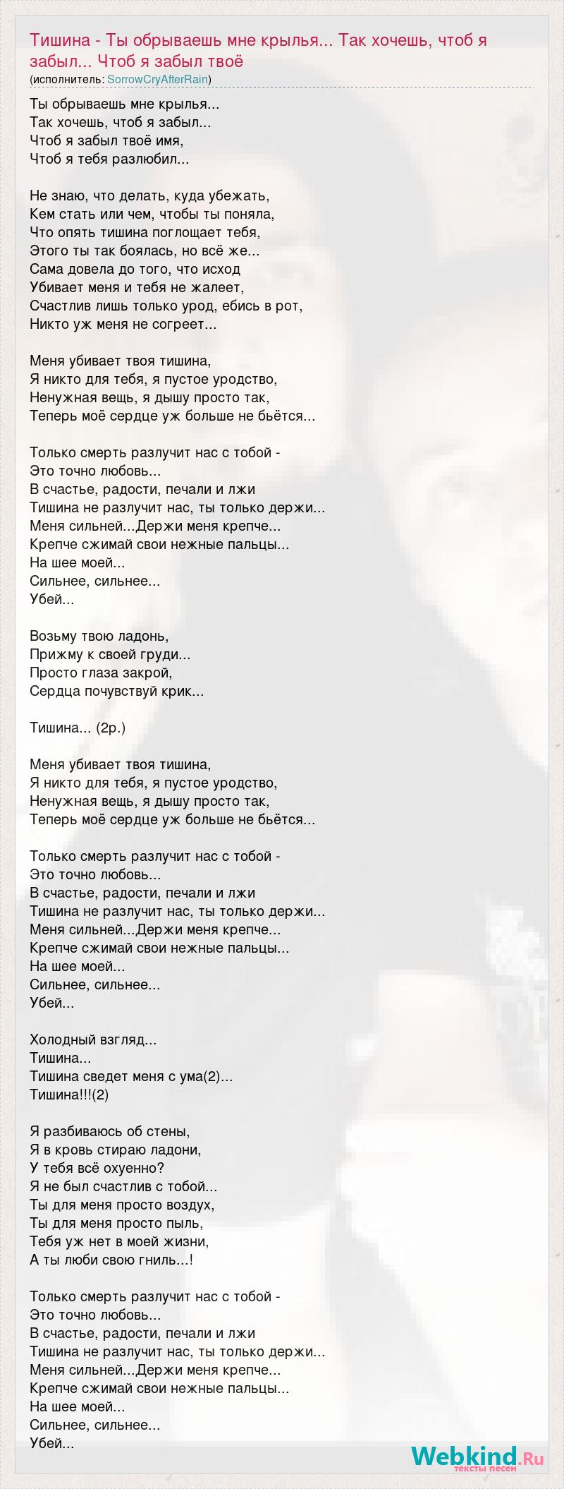Ты обрываешь мне крылья... Так хочешь, чтоб я забыл... Чтоб я забыл твоё имя, Чтоб я тебя разлюбил... Не знаю, что делать, куда убежать, Кем стать или чем, чтобы ты поняла, Что опять тишина поглощает тебя, Этого ты так боялась, но всё же... Сама довела до того, что исход Убивает меня и тебя не жалеет, Счастлив лишь только урод, ебись в рот, Никто уж меня не согреет... Меня убивает твоя тишина, Я никто для тебя, я пустое уродство, Ненужная вещь, я дышу просто так, Теперь моё сердце уж больше не бьётся... Только смерть разлучит нас с тобой - Это точно любовь... В счастье, радости, печали и лжи Тишина не разлучит нас, ты только держи... Меня сильней...Держи меня крепче... Крепче сжимай свои нежные пальцы... На шее моей... Сильнее, сильнее... Убей... Возьму твою ладонь, Прижму к своей груди... Просто глаза закрой, Cердца почувствуй крик... Тишина... (2р.) Меня убивает твоя тишина, Я никто для тебя, я пустое уродство, Ненужная вещь, я дышу просто так, Теперь моё сердце уж больше не бьётся... Только смерть разлучит нас с тобой - Это точно любовь... В счастье, радости, печали и лжи Тишина не разлучит нас, ты только держи... Меня сильней...Держи меня крепче... Крепче сжимай свои нежные пальцы... На шее моей... Сильнее, сильнее... Убей... Холодный взгляд... Тишина... Тишина сведет меня с ума(2)... Тишина!!!(2) Я разбиваюсь об стены, Я в кровь стираю ладони, У тебя всё охуенно? Я не был счастлив с тобой... Ты для меня просто воздух, Ты для меня просто пыль, Тебя уж нет в моей жизни, А ты люби свою гниль...! Только смерть разлучит нас с тобой - Это точно любовь... В счастье, радости, печали и лжи Тишина не разлучит нас, ты только держи... Меня сильней...Держи меня крепче... Крепче сжимай свои нежные пальцы... На шее моей... Сильнее, сильнее... Убей...