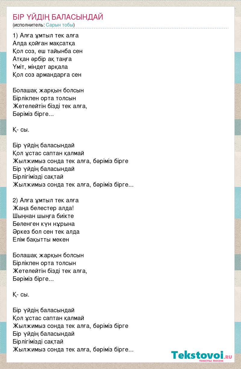 1) Алға ұмтыл тек алға Алда қойған мақсатқа Қол соз, еш тайынба сен Атқан әрбір ақ таңға Үміт, міндет арқала Қол соз армандарға сен Болашақ жарқын болсын Бірлікпен орта толсын Жетелейтін бізді тек алға, Бәріміз бірге... Қ- сы. Бір үйдің баласындай Қол ұстас саптан қалмай Жылжимыз сонда тек алға, бәріміз бірге Бір үйдің баласындай Бірлігімізді сақтай Жылжимыз сонда тек алға, бәріміз бірге... 2) Алға ұмтыл тек алға Жаңа белестер алда! Шыңнан шыңға биікте Бөленген күн нұрына Әркез бол сен тек алда Елім бақытты мекен Болашақ жарқын болсын Бірлікпен орта толсын Жетелейтін бізді тек алға, Бәріміз бірге... Қ- сы. Бір үйдің баласындай Қол ұстас саптан қалмай Жылжимыз сонда тек алға, бәріміз бірге Бір үйдің баласындай Бірлігімізді сақтай Жылжимыз сонда тек алға, бәріміз бірге...