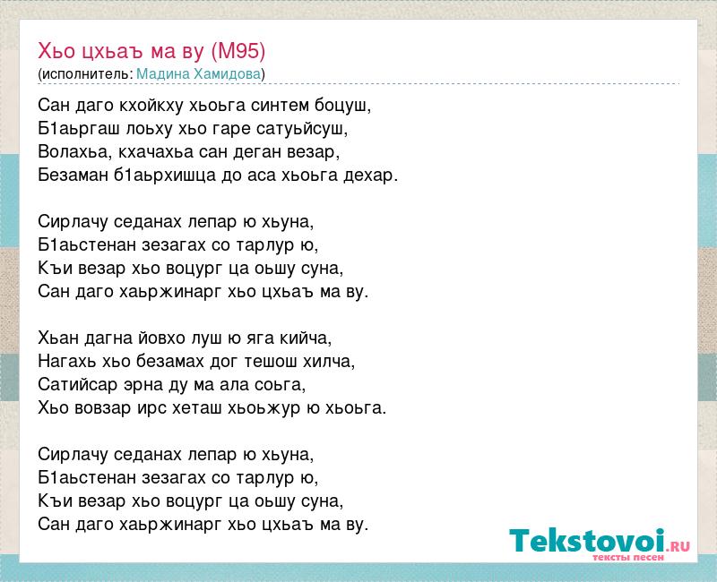 Сан даго кхойкху хьоьга синтем боцуш, Б1аьргаш лоьху хьо гаре сатуьйсуш, Волахьа, кхачахьа сан деган везар, Безаман б1аьрхишца до аса хьоьга дехар. Сирлачу седанах лепар ю хьуна, Б1аьстенан зезагах со тарлур ю, Къи везар хьо воцург ца оьшу суна, Сан даго хаьржинарг хьо цхьаъ ма ву. Хьан дагна йовхо луш ю яга кийча, Нагахь хьо безамах дог тешош хилча, Сатийсар эрна ду ма ала соьга, Хьо вовзар ирс хеташ хьоьжур ю хьоьга. Сирлачу седанах лепар ю хьуна, Б1аьстенан зезагах со тарлур ю, Къи везар хьо воцург ца оьшу суна, Сан даго хаьржинарг хьо цхьаъ ма ву.