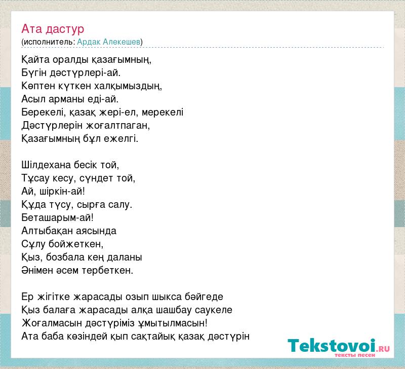 Қайта оралды қазағымның, Бүгін дәстүрлері-ай. Көптен күткен халқымыздың, Асыл арманы еді-ай. Берекелі, қазақ жері-ел, мерекелі Дәстүрлерін жоғалтпаган, Қазағымның бұл ежелгі. Шілдехана бесік той, Тұсау кесу, сүндет той, Ай, шіркін-ай! Құда түсу, сырға салу. Беташарым-ай! Алтыбақан аясында Сұлу бойжеткен, Қыз, бозбала кең даланы Әнімен әсем тербеткен. Ер жігітке жарасады озып шыкса бәйгеде Қыз балаға жарасады алқа шашбау саукеле Жоғалмасын дәстүріміз ұмытылмасын! Ата баба көзіндей қып сақтайық қазақ дәстүрін