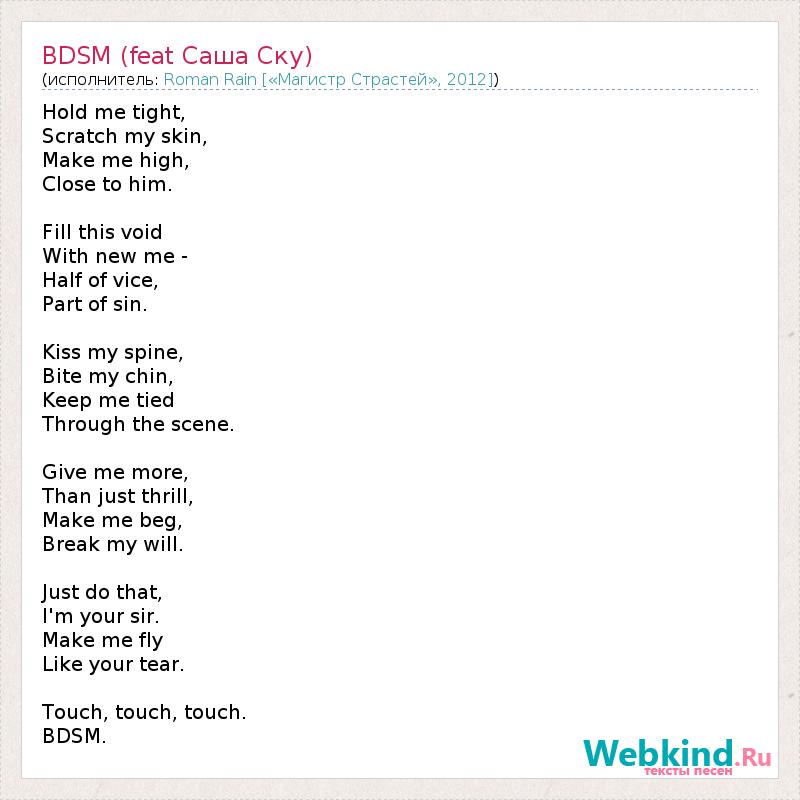 Hold me tight, Scratch my skin, Make me high, Close to him. Fill this void With new me - Half of vice, Part of sin. Kiss my spine, Bite my chin, Keep me tied Through the scene. Give me more, Than just thrill, Make me beg, Break my will. Just do that, I'm your sir. Make me fly Like your tear. Touch, touch, touch. BDSM.
