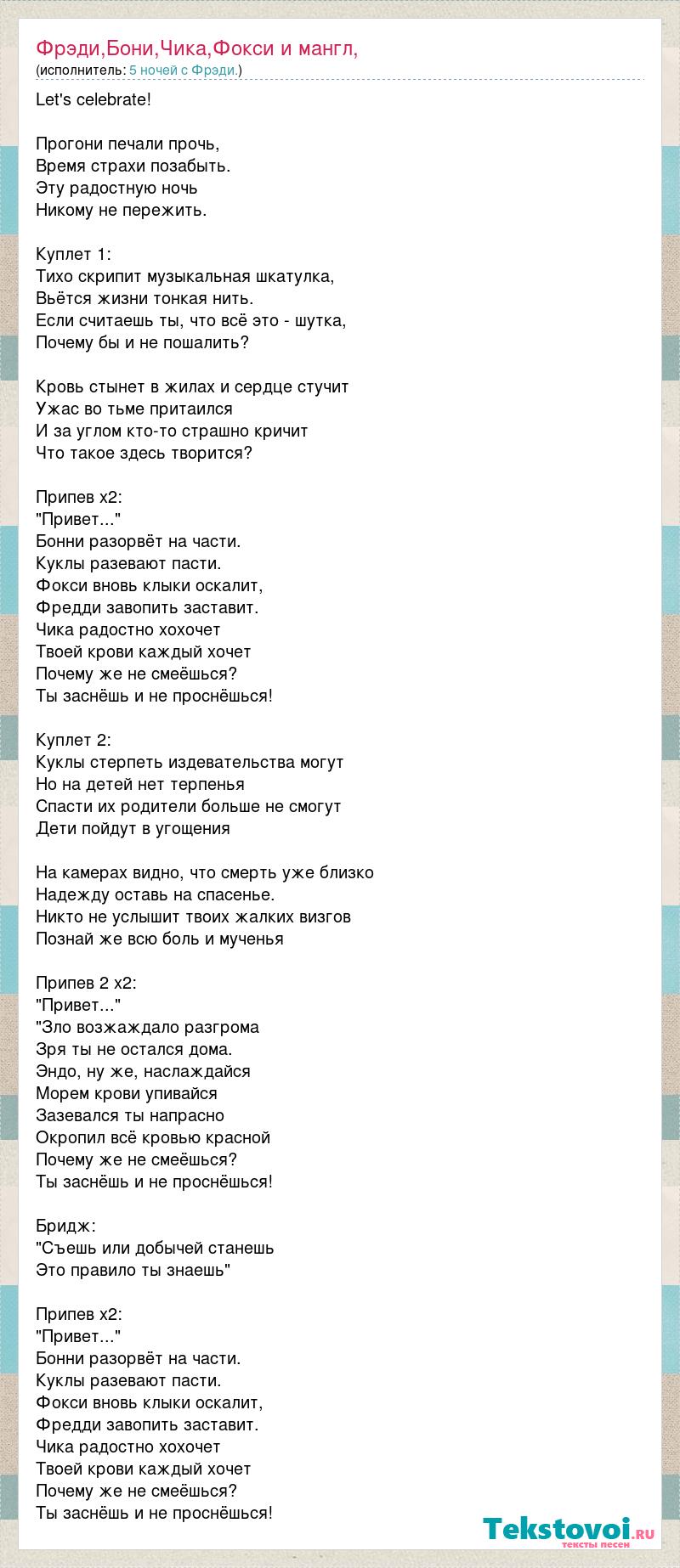 Let's celebrate! Прогони печали прочь, Время страхи позабыть. Эту радостную ночь Никому не пережить. Куплет 1: Тихо скрипит музыкальная шкатулка, Вьётся жизни тонкая нить. Если считаешь ты, что всё это - шутка, Почему бы и не пошалить? Кровь стынет в жилах и сердце стучит Ужас во тьме притаился И за углом кто-то страшно кричит Что такое здесь творится? Припев x2: "Привет..." Бонни разорвёт на части. Куклы разевают пасти. Фокси вновь клыки оскалит, Фредди завопить заставит. Чика радостно хохочет Твоей крови каждый хочет Почему же не смеёшься? Ты заснёшь и не проснёшься! Куплет 2: Куклы стерпеть издевательства могут Но на детей нет терпенья Спасти их родители больше не смогут Дети пойдут в угощения На камерах видно, что смерть уже близко Надежду оставь на спасенье. Никто не услышит твоих жалких визгов Познай же всю боль и мученья Припев 2 x2: "Привет..." "Зло возжаждало разгрома Зря ты не остался дома. Эндо, ну же, наслаждайся Морем крови упивайся Зазевался ты напрасно Окропил всё кровью красной Почему же не смеёшься? Ты заснёшь и не проснёшься! Бридж: "Съешь или добычей станешь Это правило ты знаешь" Припев x2: "Привет..." Бонни разорвёт на части. Куклы разевают пасти. Фокси вновь клыки оскалит, Фредди завопить заставит. Чика радостно хохочет Твоей крови каждый хочет Почему же не смеёшься? Ты заснёшь и не проснёшься!