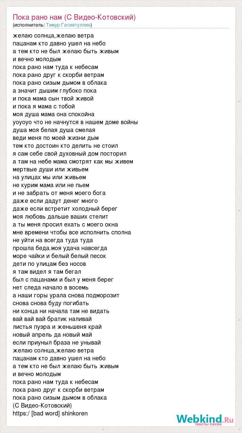 желаю солнца,желаю ветра пацанам кто давно ушел на небо а тем кто не был желаю быть живым и вечно молодым пока рано нам туда к небесам пока рано друг к скорби ветрам пока рано сизым дымом в облака а значит дышим глубоко пока и пока мама сын твой живой и пока я мама с тобой моя душа мама она спокойна уоуоуо что не начнутся в нашем доме войны душа моя белая душа смелая веди меня по моей жизни дым тем кто достоин кто делить не стоил я сам себе свой духовный дом посторил а там на небе мама смотрят как мы живем мертвые души или живьем на улицах мы или живьем не курим мама или не пьем и не забрать от меня моего бога даже если дадут денег много даже если встретит холодный берег моя любовь дальше ваших стелит а ты меня просил ехать с моего окна мне времени чтобы все исполнить сполна не уйти на всегда туда туда прошла беда.моя удача навсегда море чайки и белый белый песок дети по улицам без носов я там видел я там бегал был с пацанами и был у меня берег нет следа начало в восемь а наши горы урала снова подморозит снова снова буду погибать ни конца ни начала там не видать вай вай вай братик наливай листья пуэра и женьшеня край новый апрель да новый май если приуныл браза не унывай желаю солнца,желаю ветра пацанам кто давно ушел на небо а тем кто не был желаю быть живым и вечно молодым пока рано нам туда к небесам пока рано друг к скорби ветрам пока рано сизым дымом в облака (С Видео-Котовский) https:/ [bad word] shinkoren
