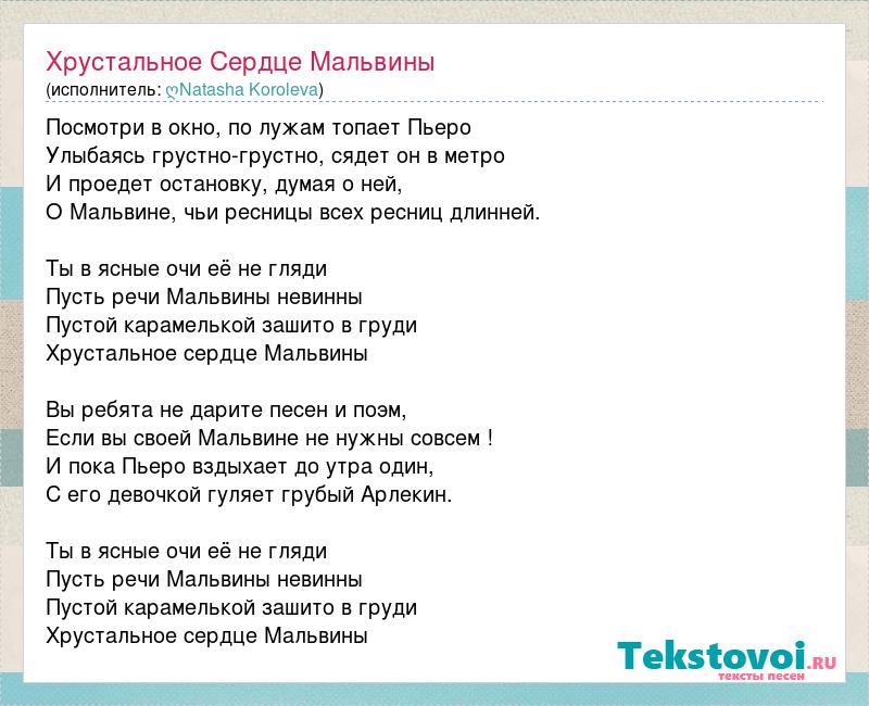Посмотри в окно, по лужам топает Пьеро Улыбаясь грустно-грустно, сядет он в метро И проедет остановку, думая о ней, О Мальвине, чьи ресницы всех ресниц длинней. Ты в ясные очи её не гляди Пусть речи Мальвины невинны Пустой карамелькой зашито в груди Хрустальное сердце Мальвины Вы ребята не дарите песен и поэм, Если вы своей Мальвине не нужны совсем ! И пока Пьеро вздыхает до утра один, С его девочкой гуляет грубый Арлекин. Ты в ясные очи её не гляди Пусть речи Мальвины невинны Пустой карамелькой зашито в груди Хрустальное сердце Мальвины