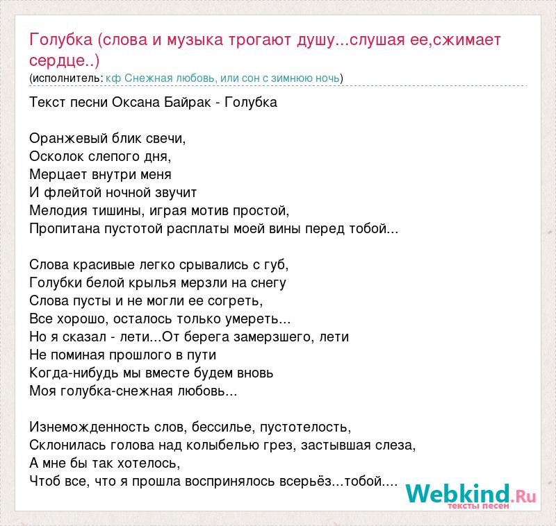 Текст песни Оксана Байрак - Голубка Оранжевый блик свечи, Осколок слепого дня, Мерцает внутри меня И флейтой ночной звучит Мелодия тишины, играя мотив простой, Пропитана пустотой расплаты моей вины перед тобой... Слова красивые легко срывались с губ, Голубки белой крылья мерзли на снегу Слова пусты и не могли ее согреть, Все хорошо, осталось только умереть... Но я сказал - лети...От берега замерзшего, лети Не поминая прошлого в пути Когда-нибудь мы вместе будем вновь Моя голубка-снежная любовь... Изнеможденность слов, бессилье, пустотелость, Склонилась голова над колыбелью грез, застывшая слеза, А мне бы так хотелось, Чтоб все, что я прошла воспринялось всерьёз...тобой....