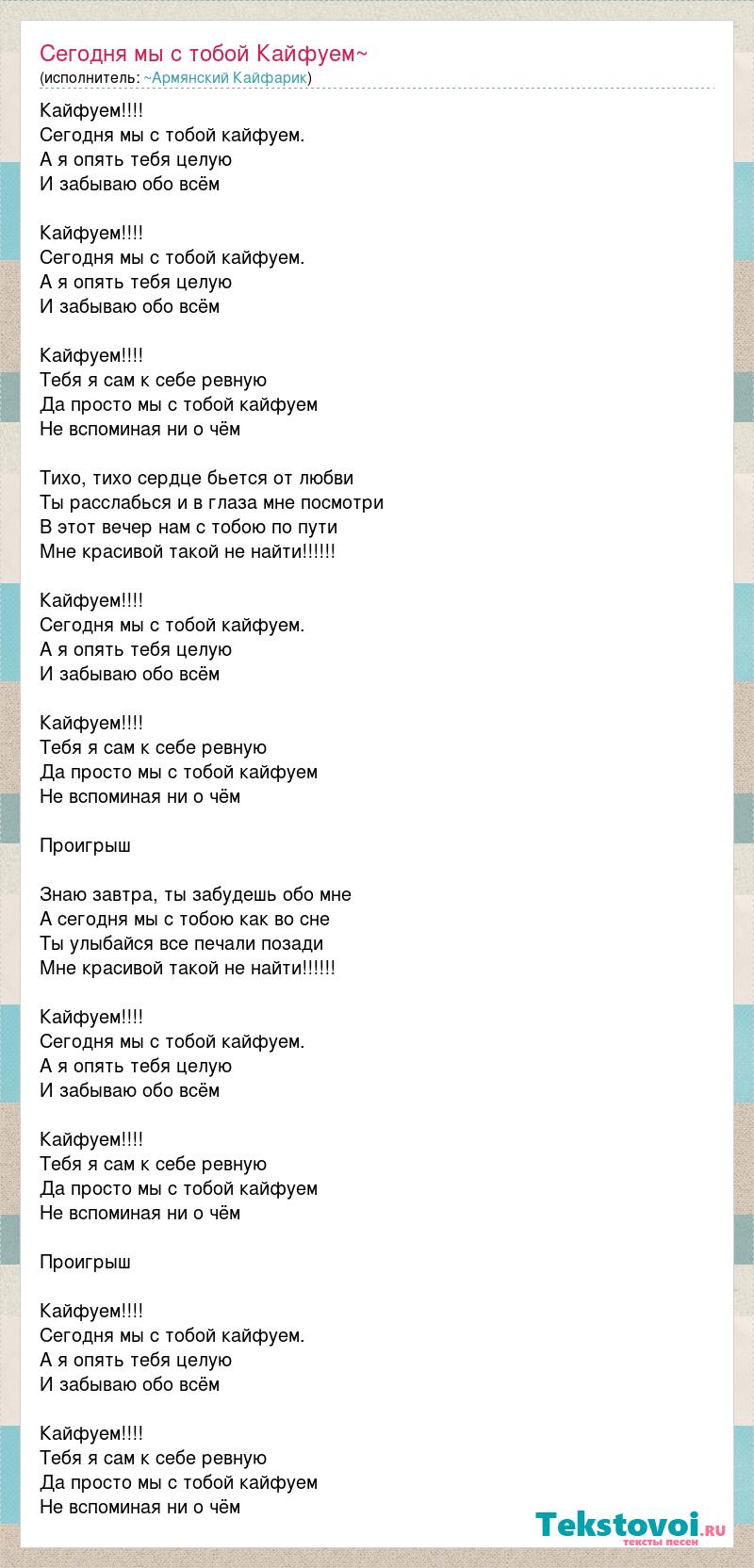 Кайфуем!!!! Сегодня мы с тобой кайфуем. А я опять тебя целую И забываю обо всём Кайфуем!!!! Сегодня мы с тобой кайфуем. А я опять тебя целую И забываю обо всём Кайфуем!!!! Тебя я сам к себе ревную Да просто мы с тобой кайфуем Не вспоминая ни о чём Тихо, тихо сердце бьется от любви Ты расслабься и в глаза мне посмотри В этот вечер нам с тобою по пути Мне красивой такой не найти!!!!!! Кайфуем!!!! Сегодня мы с тобой кайфуем. А я опять тебя целую И забываю обо всём Кайфуем!!!! Тебя я сам к себе ревную Да просто мы с тобой кайфуем Не вспоминая ни о чём Проигрыш Знаю завтра, ты забудешь обо мне А сегодня мы с тобою как во сне Ты улыбайся все печали позади Мне красивой такой не найти!!!!!! Кайфуем!!!! Сегодня мы с тобой кайфуем. А я опять тебя целую И забываю обо всём Кайфуем!!!! Тебя я сам к себе ревную Да просто мы с тобой кайфуем Не вспоминая ни о чём Проигрыш Кайфуем!!!! Сегодня мы с тобой кайфуем. А я опять тебя целую И забываю обо всём Кайфуем!!!! Тебя я сам к себе ревную Да просто мы с тобой кайфуем Не вспоминая ни о чём