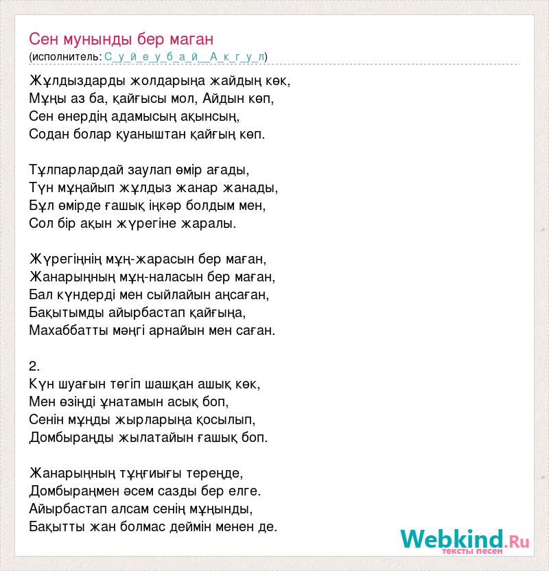 Жұлдыздарды жолдарыңа жайдың көк, Мұңы аз ба, қайғысы мол, Айдын көп, Сен өнердiң адамысың ақынсың, Содан болар қуаныштан қайғың көп. Тұлпарлардай заулап өмiр ағады, Түн мұңайып жұлдыз жанар жанады, Бұл өмiрде ғашық іңкәр болдым мен, Сол бiр ақын жүрегiне жаралы. Жүрегiңнiң мұң-жарасын бер маған, Жанарыңның мұң-наласын бер маған, Бал күндердi мен сыйлайын аңсаған, Бақытымды айырбастап қайғыңа, Махаббатты мәңгi арнайын мен саған. 2. Күн шуағын төгiп шашқан ашық көк, Мен өзiңдi ұнатамын асық боп, Сенiн мұңды жырларыңа қосылып, Домбыраңды жылатайын ғашық боп. Жанарыңның тұңғиығы тереңде, Домбыраңмен әсем сазды бер елге. Айырбастап алсам сенiң мұңынды, Бақытты жан болмас деймiн менен де.