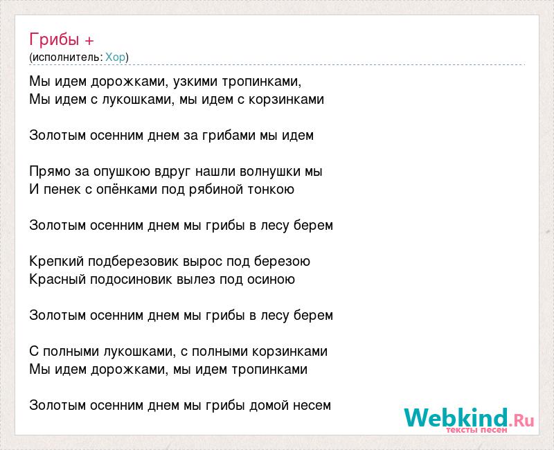 Мы идем дорожками, узкими тропинками, Мы идем с лукошками, мы идем с корзинками Золотым осенним днем за грибами мы идем Прямо за опушкою вдруг нашли волнушки мы И пенек с опёнками под рябиной тонкою Золотым осенним днем мы грибы в лесу берем Крепкий подберезовик вырос под березою Красный подосиновик вылез под осиною Золотым осенним днем мы грибы в лесу берем С полными лукошками, с полными корзинками Мы идем дорожками, мы идем тропинками Золотым осенним днем мы грибы домой несем