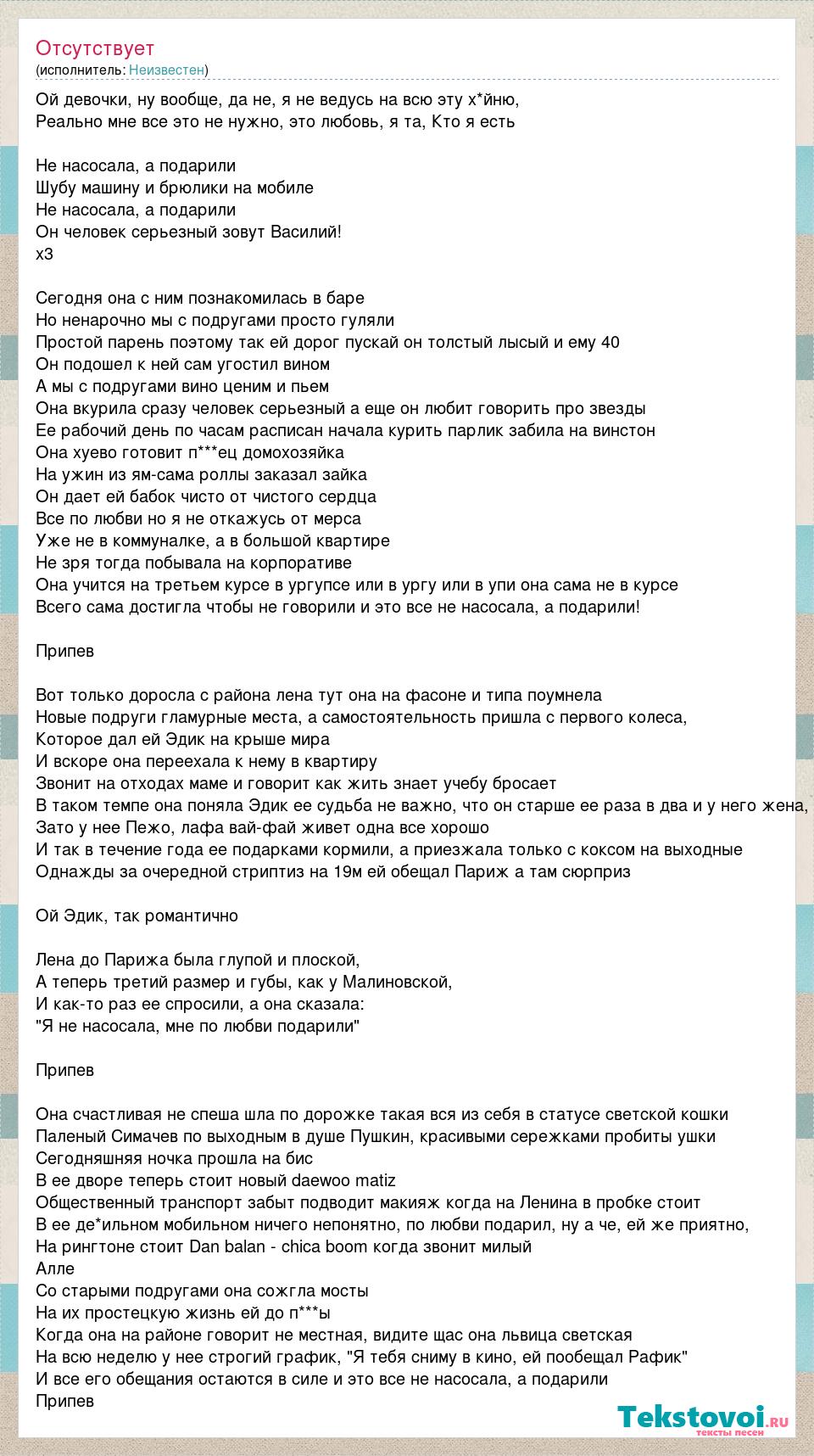 Ой девочки, ну вообще, да не, я не ведусь на всю эту х*йню, Реально мне все это не нужно, это любовь, я та, Кто я есть Не насосала, а подарили Шубу машину и брюлики на мобиле Не насосала, а подарили Он человек серьезный зовут Василий! х3 Сегодня она с ним познакомилась в баре Но ненарочно мы с подругами просто гуляли Простой парень поэтому так ей дорог пускай он толстый лысый и ему 40 Он подошел к ней сам угостил вином А мы с подругами вино ценим и пьем Она вкурила сразу человек серьезный а еще он любит говорить про звезды Ее рабочий день по часам расписан начала курить парлик забила на винстон Она хуево готовит п***ец домохозяйка На ужин из ям-сама роллы заказал зайка Он дает ей бабок чисто от чистого сердца Все по любви но я не откажусь от мерса Уже не в коммуналке, а в большой квартире Не зря тогда побывала на корпоративе Она учится на третьем курсе в ургупсе или в ургу или в упи она сама не в курсе Всего сама достигла чтобы не говорили и это все не насосала, а подарили! Припев Вот только доросла с района лена тут она на фасоне и типа поумнела Новые подруги гламурные места, а самостоятельность пришла с первого колеса, Которое дал ей Эдик на крыше мира И вскоре она переехала к нему в квартиру Звонит на отходах маме и говорит как жить знает учебу бросает В таком темпе она поняла Эдик ее судьба не важно, что он старше ее раза в два и у него жена, Зато у нее Пежо, лафа вай-фай живет одна все хорошо И так в течение года ее подарками кормили, а приезжала только с коксом на выходные Однажды за очередной стриптиз на 19м ей обещал Париж а там сюрприз Ой Эдик, так романтично Лена до Парижа была глупой и плоской, А теперь третий размер и губы, как у Малиновской, И как-то раз ее спросили, а она сказала: "Я не насосала, мне по любви подарили" Припев Она счастливая не спеша шла по дорожке такая вся из себя в статусе светской кошки Паленый Симачев по выходным в душе Пушкин, красивыми сережками пробиты ушки Сегодняшняя ночка прошла на бис В ее дворе теперь стоит новый daewoo matiz Общественный транспорт забыт подводит макияж когда на Ленина в пробке стоит В ее де*ильном мобильном ничего непонятно, по любви подарил, ну а че, ей же приятно, На рингтоне стоит Dan balan - chica boom когда звонит милый Алле Со старыми подругами она сожгла мосты На их простецкую жизнь ей до п***ы Когда она на районе говорит не местная, видите щас она львица светская На всю неделю у нее строгий график, "Я тебя сниму в кино, ей пообещал Рафик" И все его обещания остаются в силе и это все не насосала, а подарили Припев