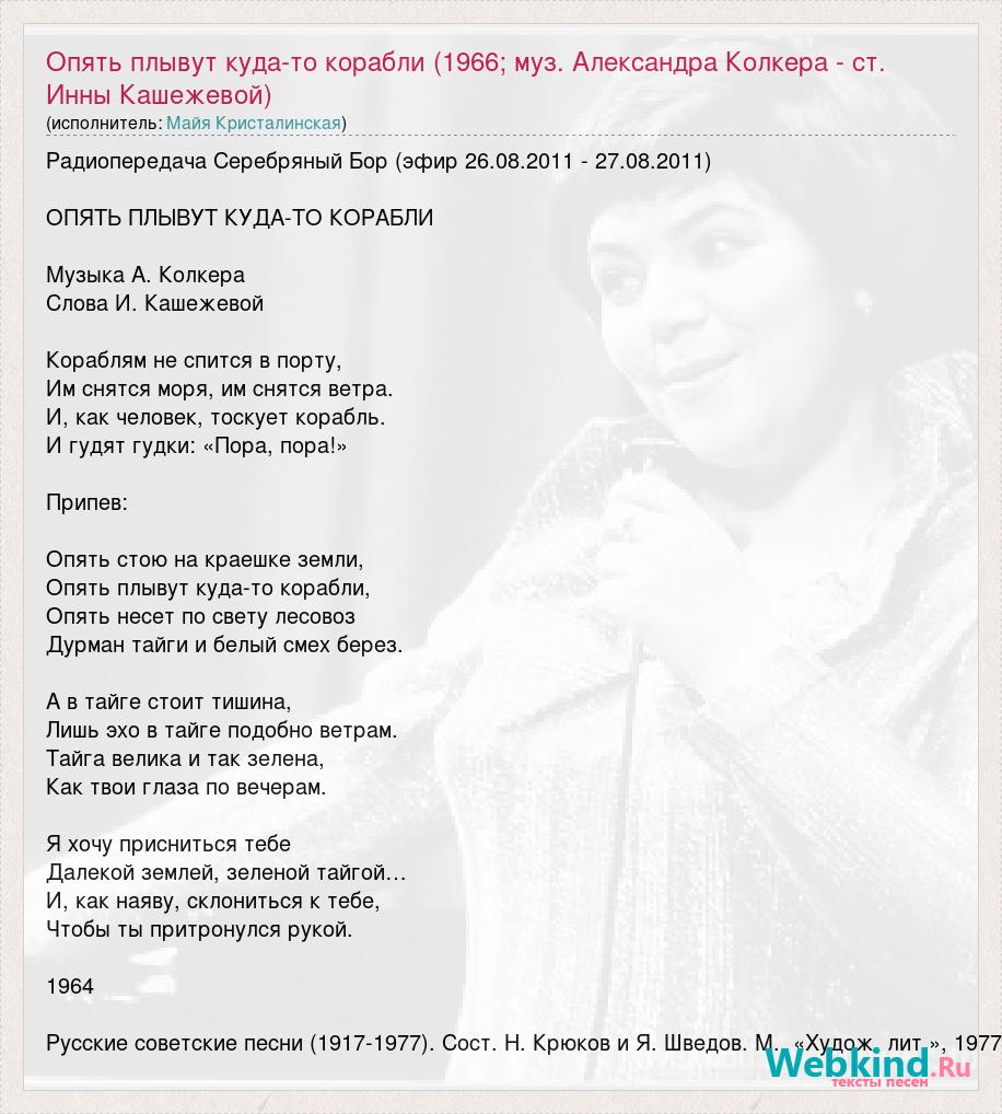 Радиопередача Серебряный Бор (эфир 26.08.2011 - 27.08.2011) ОПЯТЬ ПЛЫВУТ КУДА-ТО КОРАБЛИ Музыка А. Колкера Слова И. Кашежевой Кораблям не спится в порту, Им снятся моря, им снятся ветра. И, как человек, тоскует корабль. И гудят гудки: «Пора, пора!» Припев: Опять стою на краешке земли, Опять плывут куда-то корабли, Опять несет по свету лесовоз Дурман тайги и белый смех берез. А в тайге стоит тишина, Лишь эхо в тайге подобно ветрам. Тайга велика и так зелена, Как твои глаза по вечерам. Я хочу присниться тебе Далекой землей, зеленой тайгой… И, как наяву, склониться к тебе, Чтобы ты притронулся рукой. 1964 Русские советские песни (1917-1977). Сост. Н. Крюков и Я. Шведов. М., «Худож. лит.», 1977