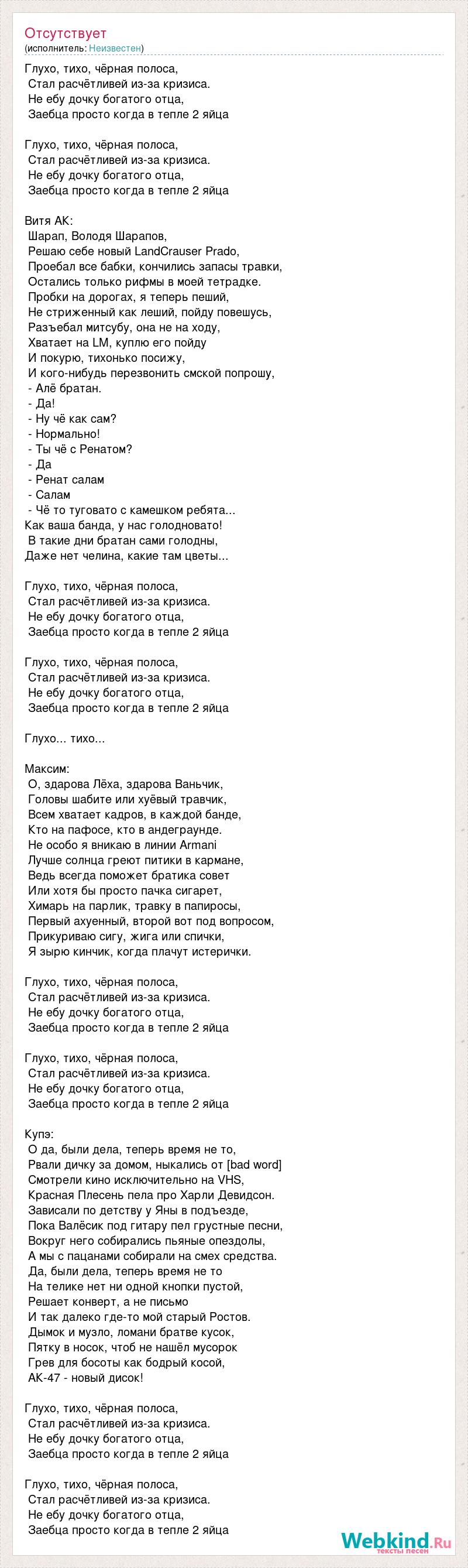 Глухо, тихо, чёрная полоса, Стал расчётливей из-за кризиса. Не ебу дочку богатого отца, Заебца просто когда в тепле 2 яйца Глухо, тихо, чёрная полоса, Стал расчётливей из-за кризиса. Не ебу дочку богатого отца, Заебца просто когда в тепле 2 яйца Витя АК: Шарап, Володя Шарапов, Решаю себе новый LandCrauser Prado, Проебал все бабки, кончились запасы травки, Остались только рифмы в моей тетрадке. Пробки на дорогах, я теперь пеший, Не стриженный как леший, пойду повешусь, Разъебал митсубу, она не на ходу, Хватает на LM, куплю его пойду И покурю, тихонько посижу, И кого-нибудь перезвонить смской попрошу, - Алё братан. - Да! - Ну чё как сам? - Нормально! - Ты чё с Ренатом? - Да - Ренат салам - Салам - Чё то туговато с камешком ребята... Как ваша банда, у нас голодновато! В такие дни братан сами голодны, Даже нет челина, какие там цветы... Глухо, тихо, чёрная полоса, Стал расчётливей из-за кризиса. Не ебу дочку богатого отца, Заебца просто когда в тепле 2 яйца Глухо, тихо, чёрная полоса, Стал расчётливей из-за кризиса. Не ебу дочку богатого отца, Заебца просто когда в тепле 2 яйца Глухо... тихо... Максим: О, здарова Лёха, здарова Ваньчик, Головы шабите или хуёвый травчик, Всем хватает кадров, в каждой банде, Кто на пафосе, кто в андеграунде. Не особо я вникаю в линии Armani Лучше солнца греют питики в кармане, Ведь всегда поможет братика совет Или хотя бы просто пачка сигарет, Химарь на парлик, травку в папиросы, Первый ахуенный, второй вот под вопросом, Прикуриваю сигу, жига или спички, Я зырю кинчик, когда плачут истерички. Глухо, тихо, чёрная полоса, Стал расчётливей из-за кризиса. Не ебу дочку богатого отца, Заебца просто когда в тепле 2 яйца Глухо, тихо, чёрная полоса, Стал расчётливей из-за кризиса. Не ебу дочку богатого отца, Заебца просто когда в тепле 2 яйца Купэ: О да, были дела, теперь время не то, Рвали дичку за домом, ныкались от [bad word] Смотрели кино исключительно на VHS, Красная Плесень пела про Харли Девидсон. Зависали по детству у Яны в подъезде, Пока Валёсик под гитару пел грустные песни, Вокруг него собирались пьяные опездолы, А мы с пацанами собирали на смех средства. Да, были дела, теперь время не то На телике нет ни одной кнопки пустой, Решает конверт, а не письмо И так далеко где-то мой старый Ростов. Дымок и музло, ломани братве кусок, Пятку в носок, чтоб не нашёл мусорок Грев для босоты как бодрый косой, АК-47 - новый дисок! Глухо, тихо, чёрная полоса, Стал расчётливей из-за кризиса. Не ебу дочку богатого отца, Заебца просто когда в тепле 2 яйца Глухо, тихо, чёрная полоса, Стал расчётливей из-за кризиса. Не ебу дочку богатого отца, Заебца просто когда в тепле 2 яйца