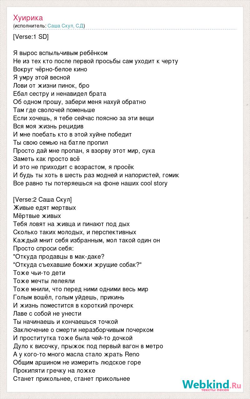 [Verse:1 SD] Я вырос вспыльчивым ребёнком Не из тех кто после первой просьбы сам уходит к черту Вокруг чёрно-белое кино Я умру этой весной Лови от жизни пинок, бро Ебал сестру и ненавидел брата Об одном прошу, забери меня нахуй обратно Там где сволочей поменьше Если хочешь, я тебе сейчас поясню за эти вещи Вся моя жизнь рецидив И мне поебать кто в этой хуйне победит Ты свою семью на батле пропил Просто дай мне пропан, я взорву этот мир, сука Заметь как просто всё И это не приходит с возрастом, я просёк И будь ты хоть в шесть раз модней и напористей, гомик Все равно ты потеряешься на фоне наших cool story [Verse:2 Саша Скул] Живые едят мертвых Мёртвые живых Тебя ловят на живца и пинают под дых Сколько таких молодых, и перспективных Каждый мнит себя избранным, мол такой один он Просто спроси себя: "Откуда продавцы в мак-даке? "Откуда съехавшие бомжи жрущие собак?" Тоже чьи-то дети Тоже мечты лелеяли Тоже мнили, что перед ними одними весь мир Голым вошёл, голым уйдешь, прикинь И жизнь поместится в короткий прочерк Лаве с собой не унести Ты начинаешь и кончаешься точкой Заключение о смерти неразборчивым почерком И проститутка тоже была чей-то дочкой Дуло к височку, прыжок под первый вагон в метро А у кого-то много масла стало жрать Reno Общим аршином не измерить людское горе Прокипяти гречку на ложке Станет прикольнее, станет прикольнее