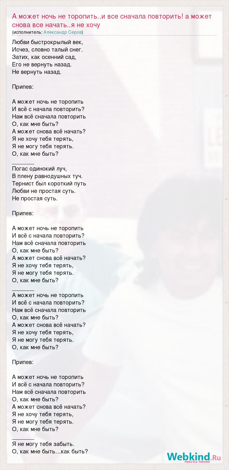 Любви быстрокрылый век, Исчез, словно талый снег. Затих, как осенний сад, Его не вернуть назад. Не вернуть назад. Припев: А может ночь не торопить И всё с начала повторить? Нам всё сначала повторить О, как мне быть? А может снова всё начать? Я не хочу тебя терять, Я не могу тебя терять. О, как мне быть? _______ Погас одинокий луч, В плену равнодушных туч. Тернист был короткий путь Любви не простая суть. Не простая суть. Припев: А может ночь не торопить И всё с начала повторить? Нам всё сначала повторить О, как мне быть? А может снова всё начать? Я не хочу тебя терять, Я не могу тебя терять. О, как мне быть? _______ А может ночь не торопить И всё с начала повторить? Нам всё сначала повторить О, как мне быть? А может снова всё начать? Я не хочу тебя терять, Я не могу тебя терять. О, как мне быть? Припев: А может ночь не торопить И всё с начала повторить? Нам всё сначала повторить О, как мне быть? А может снова всё начать? Я не хочу тебя терять, Я не могу тебя терять. О, как мне быть? _______ Я не могу тебя забыть. О, как мне быть…как быть?