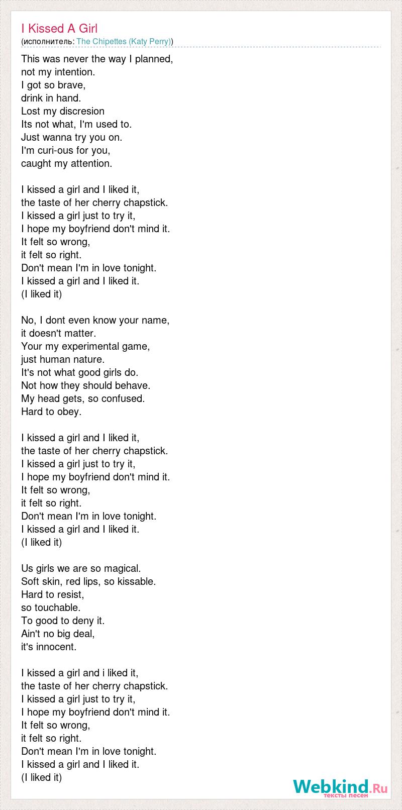 This was never the way I planned, not my intention. I got so brave, drink in hand. Lost my discresion Its not what, I'm used to. Just wanna try you on. I'm curi-ous for you, caught my attention. I kissed a girl and I liked it, the taste of her cherry chapstick. I kissed a girl just to try it, I hope my boyfriend don't mind it. It felt so wrong, it felt so right. Don't mean I'm in love tonight. I kissed a girl and I liked it. (I liked it) No, I dont even know your name, it doesn't matter. Your my experimental game, just human nature. It's not what good girls do. Not how they should behave. My head gets, so confused. Hard to obey. I kissed a girl and I liked it, the taste of her cherry chapstick. I kissed a girl just to try it, I hope my boyfriend don't mind it. It felt so wrong, it felt so right. Don't mean I'm in love tonight. I kissed a girl and I liked it. (I liked it) Us girls we are so magical. Soft skin, red lips, so kissable. Hard to resist, so touchable. To good to deny it. Ain't no big deal, it's innocent. I kissed a girl and i liked it, the taste of her cherry chapstick. I kissed a girl just to try it, I hope my boyfriend don't mind it. It felt so wrong, it felt so right. Don't mean I'm in love tonight. I kissed a girl and I liked it. (I liked it)