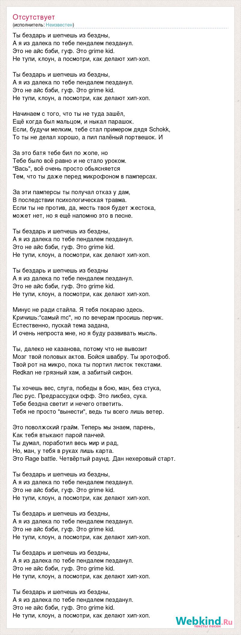 Ты бездарь и шепчешь из бездны, А я из далека по тебе пендалем пезданул. Это не айс бэби, гуф. Это grime kid. Не тупи, клоун, а посмотри, как делают хип-хоп. Ты бездарь и шепчешь из бездны, А я из далека по тебе пендалем пезданул. Это не айс бэби, гуф. Это grime kid. Не тупи, клоун, а посмотри, как делают хип-хоп. Начинаем с того, что ты не туда зашёл, Ещё когда был мальцом, и ныкал парашок. Если, будучи мелким, тебе стал примером дядя Schokk, То ты не делал хорошо, а пил палёный портвешок. И За это батя тебе бил по жопе, но Тебе было всё равно и не стало уроком. "Вась", всё очень просто обьясняется Тем, что ты даже перед микрофоном в памперсах. За эти памперсы ты получал отказ у дам, В последствии психологическая травма. Если ты не против, да, месть твоя будет жестока, может нет, но я ещё напомню это в песне. Ты бездарь и шепчешь из бездны, А я из далека по тебе пендалем пезданул. Это не айс бэби, гуф. Это grime kid. Не тупи, клоун, а посмотри, как делают хип-хоп. Ты бездарь и шепчешь из бездны А я из далека по тебе пендалем пезданул. Это не айс бэби, гуф. Это grime kid. Не тупи, клоун, а посмотри, как делают хип-хоп. Минус не ради стайла. Я тебя покараю здесь. Кричишь:"самый mc", но по вечерам просишь перчик. Естественно, пускай тема задана, И очень непроста мне, но я буду развивать мысль. Ты, далеко не казанова, потому что не вывозит Мозг твой половых актов. Бойся швабру. Ты эротофоб. Твой рот на микро, пока ты портил листок текстами. Redkan не грязный хам, а забитый сифон. Ты хочешь вес, слуга, победы в бою, ман, без стука, Лес рус. Предрассудки офф. Это ликбез, сука. Тебе бездна светит и нечего ответить. Тебя не просто "вынести", ведь ты всего лишь ветер. Это поволжский грайм. Теперь мы знаем, парень, Как тебя втыкают парой панчей. Ты думал, поработил весь мир и рад, Но, ман, у тебя в руках лишь карта. Это Rage battle. Четвёртый раунд. Дан нехеровый старт. Ты бездарь и шепчешь из бездны, А я из далека по тебе пендалем пезданул. Это не айс бэби, гуф. Это grime kid. Не тупи, клоун, а посмотри, как делают хип-хоп. Ты бездарь и шепчешь из бездны, А я из далека по тебе пендалем пезданул. Это не айс бэби, гуф. Это grime kid. Не тупи, клоун, а посмотри, как делают хип-хоп. Ты бездарь и шепчешь из бездны, А я из далека по тебе пендалем пезданул. Это не айс бэби, гуф. Это grime kid. Не тупи, клоун, а посмотри, как делают хип-хоп. Ты бездарь и шепчешь из бездны, А я из далека по тебе пендалем пезданул. Это не айс бэби, гуф. Это grime kid. Не тупи, клоун, а посмотри, как делают хип-хоп.