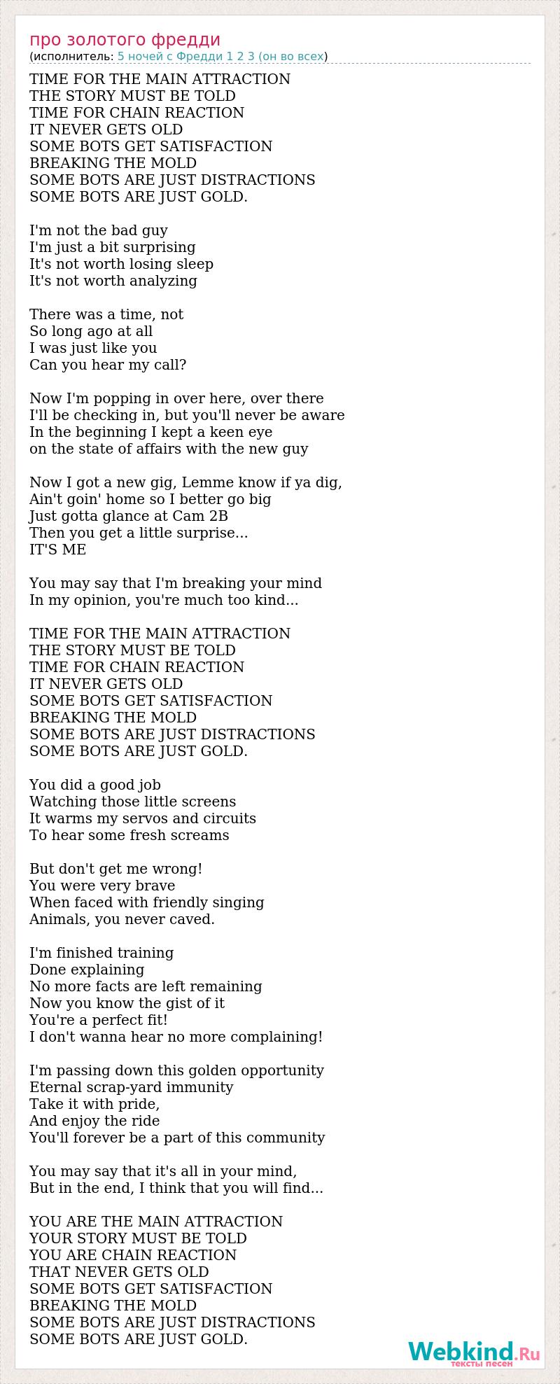 TIME FOR THE MAIN ATTRACTION THE STORY MUST BE TOLD TIME FOR CHAIN REACTION IT NEVER GETS OLD SOME BOTS GET SATISFACTION BREAKING THE MOLD SOME BOTS ARE JUST DISTRACTIONS SOME BOTS ARE JUST GOLD. I'm not the bad guy I'm just a bit surprising It's not worth losing sleep It's not worth analyzing There was a time, not So long ago at all I was just like you Can you hear my call? Now I'm popping in over here, over there I'll be checking in, but you'll never be aware In the beginning I kept a keen eye on the state of affairs with the new guy Now I got a new gig, Lemme know if ya dig, Ain't goin' home so I better go big Just gotta glance at Cam 2B Then you get a little surprise... IT'S ME You may say that I'm breaking your mind In my opinion, you're much too kind... TIME FOR THE MAIN ATTRACTION THE STORY MUST BE TOLD TIME FOR CHAIN REACTION IT NEVER GETS OLD SOME BOTS GET SATISFACTION BREAKING THE MOLD SOME BOTS ARE JUST DISTRACTIONS SOME BOTS ARE JUST GOLD. You did a good job Watching those little screens It warms my servos and circuits To hear some fresh screams But don't get me wrong! You were very brave When faced with friendly singing Animals, you never caved. I'm finished training Done explaining No more facts are left remaining Now you know the gist of it You're a perfect fit! I don't wanna hear no more complaining! I'm passing down this golden opportunity Eternal scrap-yard immunity Take it with pride, And enjoy the ride You'll forever be a part of this community You may say that it's all in your mind, But in the end, I think that you will find... YOU ARE THE MAIN ATTRACTION YOUR STORY MUST BE TOLD YOU ARE CHAIN REACTION THAT NEVER GETS OLD SOME BOTS GET SATISFACTION BREAKING THE MOLD SOME BOTS ARE JUST DISTRACTIONS SOME BOTS ARE JUST GOLD.