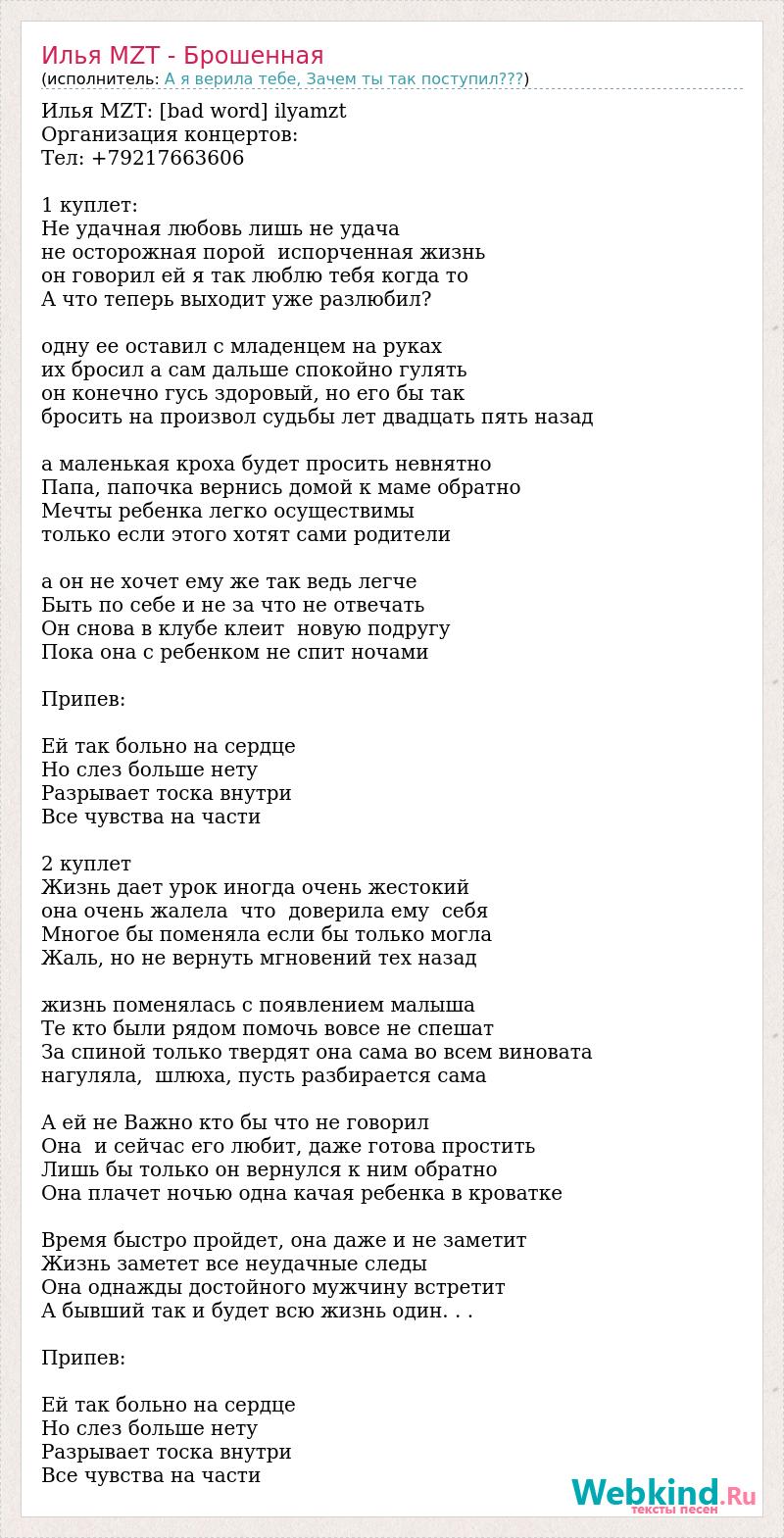 Илья MZT: [bad word] ilyamzt Организация концертов: Тел: +79217663606 1 куплет: Не удачная любовь лишь не удача не осторожная порой испорченная жизнь он говорил ей я так люблю тебя когда то А что теперь выходит уже разлюбил? одну ее оставил с младенцем на руках их бросил а сам дальше спокойно гулять он конечно гусь здоровый, но его бы так бросить на произвол судьбы лет двадцать пять назад а маленькая кроха будет просить невнятно Папа, папочка вернись домой к маме обратно Мечты ребенка легко осуществимы только если этого хотят сами родители а он не хочет ему же так ведь легче Быть по себе и не за что не отвечать Он снова в клубе клеит новую подругу Пока она с ребенком не спит ночами Припев: Ей так больно на сердце Но слез больше нету Разрывает тоска внутри Все чувства на части 2 куплет Жизнь дает урок иногда очень жестокий она очень жалела что доверила ему себя Многое бы поменяла если бы только могла Жаль, но не вернуть мгновений тех назад жизнь поменялась с появлением малыша Те кто были рядом помочь вовсе не спешат За спиной только твердят она сама во всем виновата нагуляла, шлюха, пусть разбирается сама А ей не Важно кто бы что не говорил Она и сейчас его любит, даже готова простить Лишь бы только он вернулся к ним обратно Она плачет ночью одна качая ребенка в кроватке Время быстро пройдет, она даже и не заметит Жизнь заметет все неудачные следы Она однажды достойного мужчину встретит А бывший так и будет всю жизнь один. . . Припев: Ей так больно на сердце Но слез больше нету Разрывает тоска внутри Все чувства на части