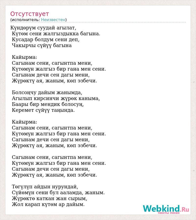 Күндөрүм суудай агылат, Күтөм сени жалгыздыкка багына. Кусадар болдум сени деп, Чакырчы сүйүү багына Кайырма: Сагынам сени, сагынтпа мени, Күтөмүн жалгыз бир гана мен сени. Сагынам дечи сен дагы мени, Жүрөктү ая, жаным, көп эзбечи. Болсоңчу дайым жанымда, Агылып кирсинчи жүрөк каныма, Баары бир мендик болосуң, Керемет сүйүү таңында. Кайырма: Сагынам сени, сагынтпа мени, Күтөмүн жалгыз бир гана мен сени. Сагынам дечи сен дагы мени, Жүрөктү ая, жаным, көп эзбечи. Сагынам сени, сагынтпа мени, Күтөмүн жалгыз бир гана мен сени. Сагынам дечи сен дагы мени, Жүрөктү ая, жаным, көп эзбечи. Төгүлүп айдын нурундай, Сүйөмүн сени бул ааламда, жаным. Жүрөктө каткан жан сырым, Жол карап күтөм ар дайым.