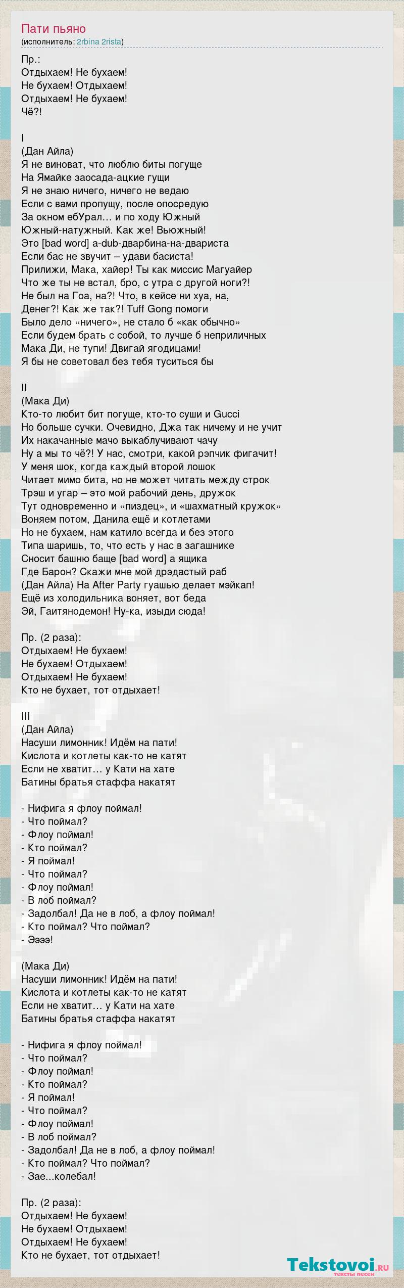 Пр.: Отдыхаем! Не бухаем! Не бухаем! Отдыхаем! Отдыхаем! Не бухаем! Чё?! I (Дан Айла) Я не виноват, что люблю биты погуще На Ямайке заосада-ацкие гущи Я не знаю ничего, ничего не ведаю Если с вами пропущу, после опосредую За окном ебУрал… и по ходу Южный Южный-натужный. Как же! Вьюжный! Это [bad word] a-dub-дварбина-на-двариста Если бас не звучит – удави басиста! Прилижи, Мака, хайер! Ты как миссис Магуайер Что же ты не встал, бро, с утра с другой ноги?! Не был на Гоа, на?! Что, в кейсе ни хуа, на, Денег?! Как же так?! Tuff Gong помоги Было дело «ничего», не стало б «как обычно» Если будем брать с собой, то лучше б неприличных Мака Ди, не тупи! Двигай ягодицами! Я бы не советовал без тебя туситься бы II (Мака Ди) Кто-то любит бит погуще, кто-то суши и Gucci Но больше сучки. Очевидно, Джа так ничему и не учит Их накачанные мачо выкаблучивают чачу Ну а мы то чё?! У нас, смотри, какой рэпчик фигачит! У меня шок, когда каждый второй лошок Читает мимо бита, но не может читать между строк Трэш и угар – это мой рабочий день, дружок Тут одновременно и «пиздец», и «шахматный кружок» Воняем потом, Данила ещё и котлетами Но не бухаем, нам катило всегда и без этого Типа шаришь, то, что есть у нас в загашнике Сносит башню баще [bad word] а ящика Где Барон? Скажи мне мой дрэдастый раб (Дан Айла) На After Party гуашью делает мэйкап! Ещё из холодильника воняет, вот беда Эй, Гаитянодемон! Ну-ка, изыди сюда! Пр. (2 раза): Отдыхаем! Не бухаем! Не бухаем! Отдыхаем! Отдыхаем! Не бухаем! Кто не бухает, тот отдыхает! III (Дан Айла) Насуши лимонник! Идём на пати! Кислота и котлеты как-то не катят Если не хватит… у Кати на хате Батины братья стаффа накатят - Нифига я флоу поймал! - Что поймал? - Флоу поймал! - Кто поймал? - Я поймал! - Что поймал? - Флоу поймал! - В лоб поймал? - Задолбал! Да не в лоб, а флоу поймал! - Кто поймал? Что поймал? - Ээээ! (Мака Ди) Насуши лимонник! Идём на пати! Кислота и котлеты как-то не катят Если не хватит… у Кати на хате Батины братья стаффа накатят - Нифига я флоу поймал! - Что поймал? - Флоу поймал! - Кто поймал? - Я поймал! - Что поймал? - Флоу поймал! - В лоб поймал? - Задолбал! Да не в лоб, а флоу поймал! - Кто поймал? Что поймал? - Зае...колебал! Пр. (2 раза): Отдыхаем! Не бухаем! Не бухаем! Отдыхаем! Отдыхаем! Не бухаем! Кто не бухает, тот отдыхает!