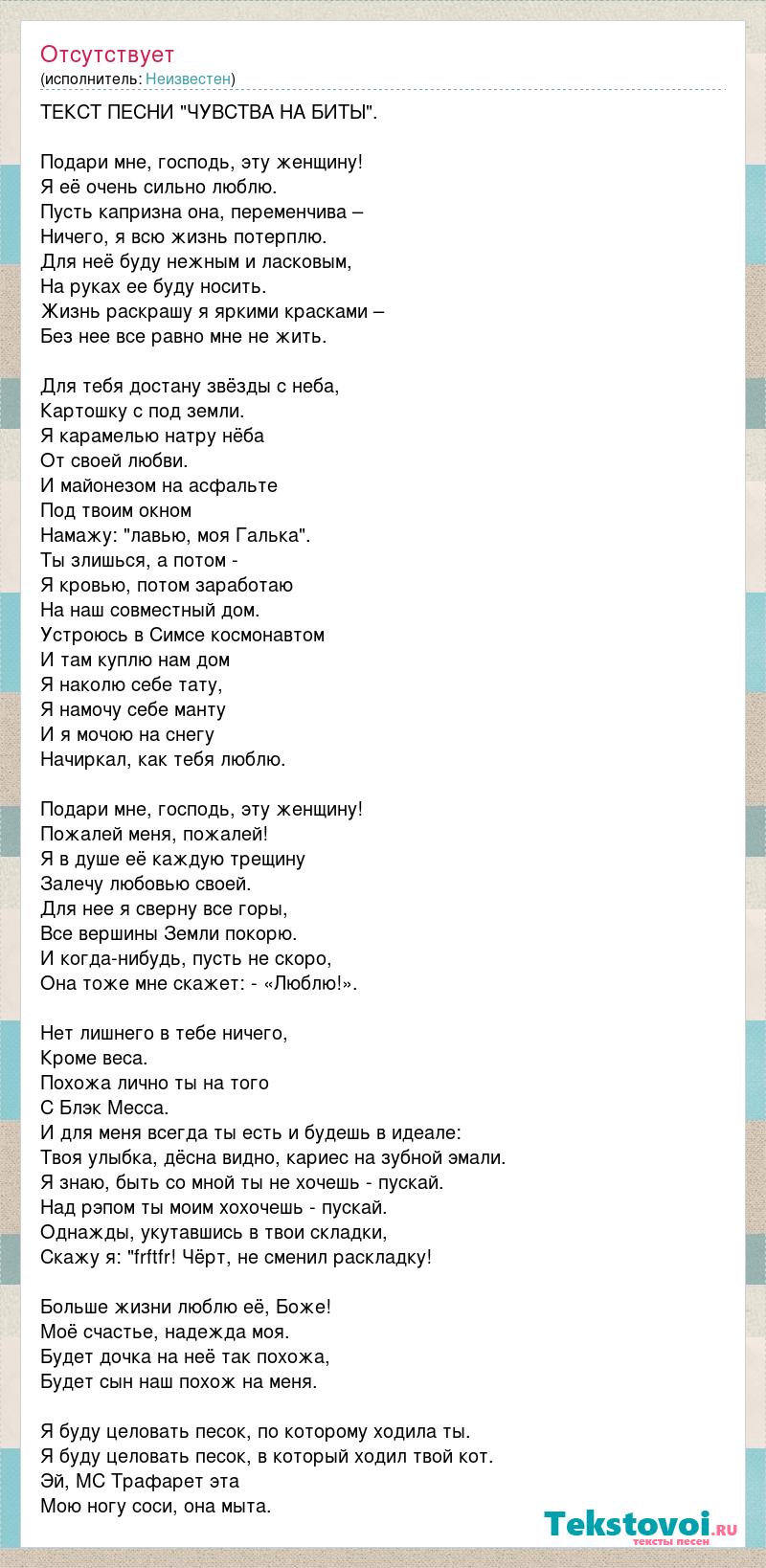 ТЕКСТ ПЕСНИ "ЧУВСТВА НА БИТЫ". Подари мне, господь, эту женщину! Я её очень сильно люблю. Пусть капризна она, переменчива – Ничего, я всю жизнь потерплю. Для неё буду нежным и ласковым, На руках ее буду носить. Жизнь раскрашу я яркими красками – Без нее все равно мне не жить. Для тебя достану звёзды с неба, Картошку с под земли. Я карамелью натру нёба От своей любви. И майонезом на асфальте Под твоим окном Намажу: "лавью, моя Галька". Ты злишься, а потом - Я кровью, потом заработаю На наш совместный дом. Устроюсь в Симсе космонавтом И там куплю нам дом Я наколю себе тату, Я намочу себе манту И я мочою на снегу Начиркал, как тебя люблю. Подари мне, господь, эту женщину! Пожалей меня, пожалей! Я в душе её каждую трещину Залечу любовью своей. Для нее я сверну все горы, Все вершины Земли покорю. И когда-нибудь, пусть не скоро, Она тоже мне скажет: - «Люблю!». Нет лишнего в тебе ничего, Кроме веса. Похожа лично ты на того С Блэк Месса. И для меня всегда ты есть и будешь в идеале: Твоя улыбка, дёсна видно, кариес на зубной эмали. Я знаю, быть со мной ты не хочешь - пускай. Над рэпом ты моим хохочешь - пускай. Однажды, укутавшись в твои складки, Скажу я: "frftfr! Чёрт, не сменил раскладку! Больше жизни люблю её, Боже! Моё счастье, надежда моя. Будет дочка на неё так похожа, Будет сын наш похож на меня. Я буду целовать песок, по которому ходила ты. Я буду целовать песок, в который ходил твой кот. Эй, МС Трафарет эта Мою ногу соси, она мыта.
