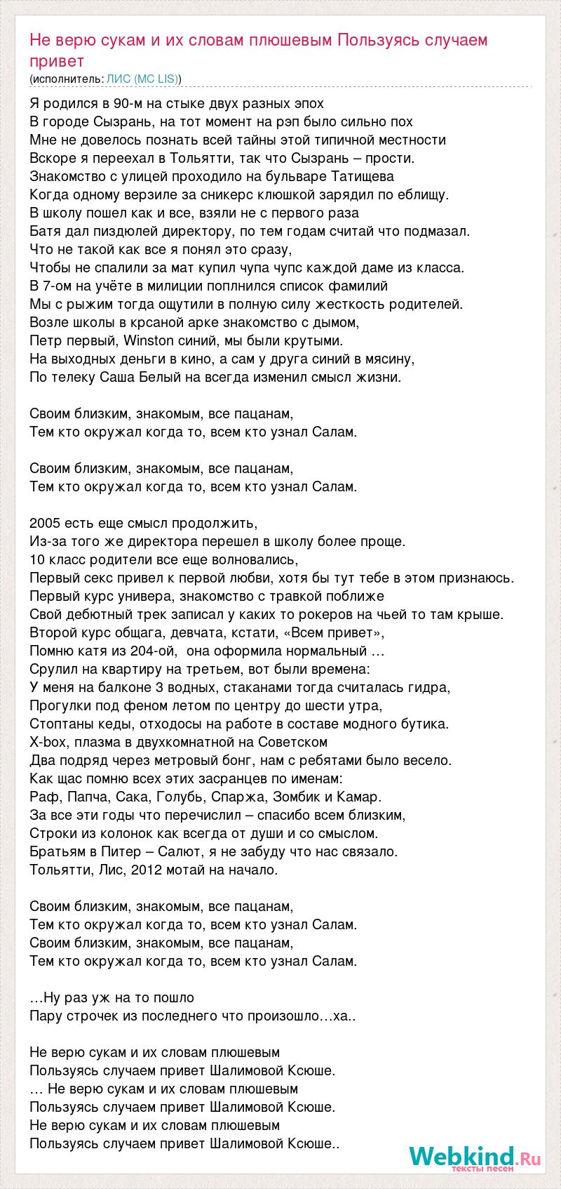 Я родился в 90-м на стыке двух разных эпох В городе Сызрань, на тот момент на рэп было сильно пох Мне не довелось познать всей тайны этой типичной местности Вскоре я переехал в Тольятти, так что Сызрань – прости. Знакомство с улицей проходило на бульваре Татищева Когда одному верзиле за сникерс клюшкой зарядил по еблищу. В школу пошел как и все, взяли не с первого раза Батя дал пиздюлей директору, по тем годам считай что подмазал. Что не такой как все я понял это сразу, Чтобы не спалили за мат купил чупа чупс каждой даме из класса. В 7-ом на учёте в милиции поплнился список фамилий Мы с рыжим тогда ощутили в полную силу жесткость родителей. Возле школы в крсаной арке знакомство с дымом, Петр первый, Winston синий, мы были крутыми. На выходных деньги в кино, а сам у друга синий в мясину, По телеку Саша Белый на всегда изменил смысл жизни. Своим близким, знакомым, все пацанам, Тем кто окружал когда то, всем кто узнал Салам. Своим близким, знакомым, все пацанам, Тем кто окружал когда то, всем кто узнал Салам. 2005 есть еще смысл продолжить, Из-за того же директора перешел в школу более проще. 10 класс родители все еще волновались, Первый секс привел к первой любви, хотя бы тут тебе в этом признаюсь. Первый курс универа, знакомство с травкой поближе Свой дебютный трек записал у каких то рокеров на чьей то там крыше. Второй курс общага, девчата, кстати, «Всем привет», Помню катя из 204-ой, она оформила нормальный … Срулил на квартиру на третьем, вот были времена: У меня на балконе 3 водных, стаканами тогда считалась гидра, Прогулки под феном летом по центру до шести утра, Стоптаны кеды, отходосы на работе в составе модного бутика. X-box, плазма в двухкомнатной на Советском Два подряд через метровый бонг, нам с ребятами было весело. Как щас помню всех этих засранцев по именам: Раф, Папча, Сака, Голубь, Спаржа, Зомбик и Камар. За все эти годы что перечислил – спасибо всем близким, Строки из колонок как всегда от души и со смыслом. Братьям в Питер – Салют, я не забуду что нас связало. Тольятти, Лис, 2012 мотай на начало. Своим близким, знакомым, все пацанам, Тем кто окружал когда то, всем кто узнал Салам. Своим близким, знакомым, все пацанам, Тем кто окружал когда то, всем кто узнал Салам. …Ну раз уж на то пошло Пару строчек из последнего что произошло…ха.. Не верю сукам и их словам плюшевым Пользуясь случаем привет Шалимовой Ксюше. … Не верю сукам и их словам плюшевым Пользуясь случаем привет Шалимовой Ксюше. Не верю сукам и их словам плюшевым Пользуясь случаем привет Шалимовой Ксюше..